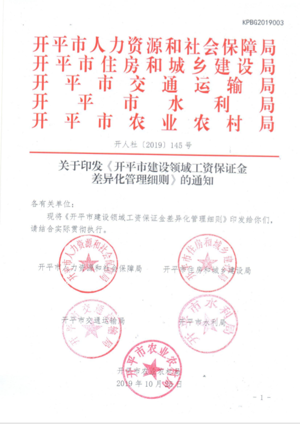 開人社〔2019〕145號(hào) 關(guān)于印發(fā)《開平市建設(shè)領(lǐng)域工資保證金差異化管理細(xì)則》的通知