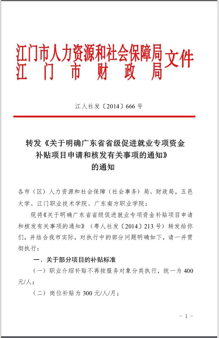 關于明確廣東省省級促進就業專項資金補貼項目申請和核發有關事項的通知