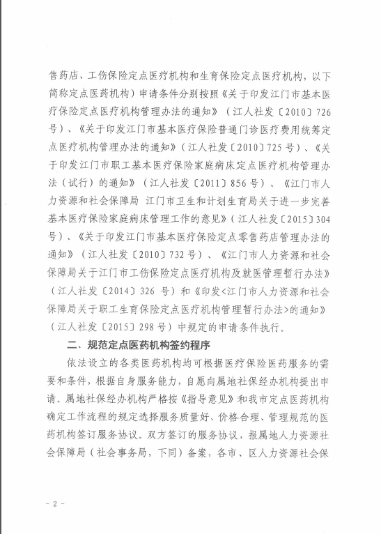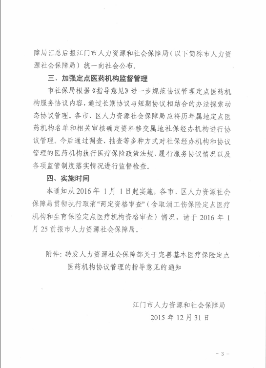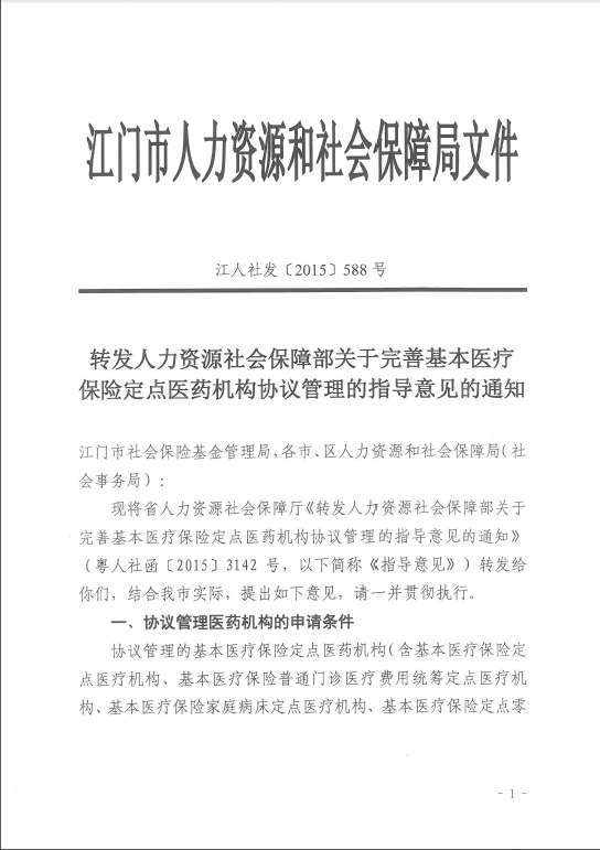轉發江門市人力資源和社會保障局《轉發人力資源社會保障部 <關于完善基本醫療保險定點醫藥機構協議管理的指導意見的通知> 的通知》的通知 關于完善基本醫療保險定點醫藥機構協議管理的指導意見的通知>