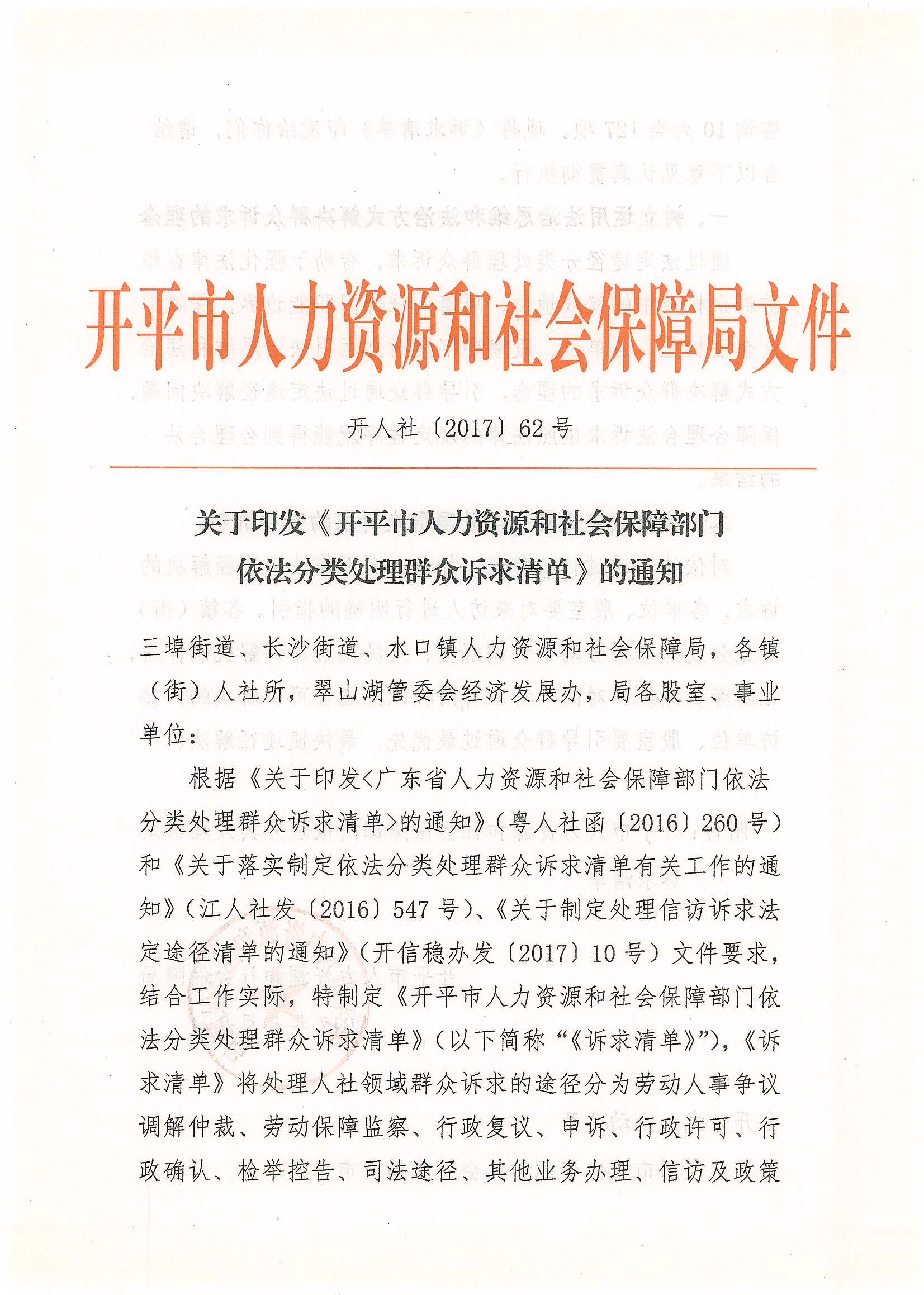 開人社【2017】62號 關于印發《開平市人力資源和社會保障部門依法分類處理群眾訴求清單》的通知