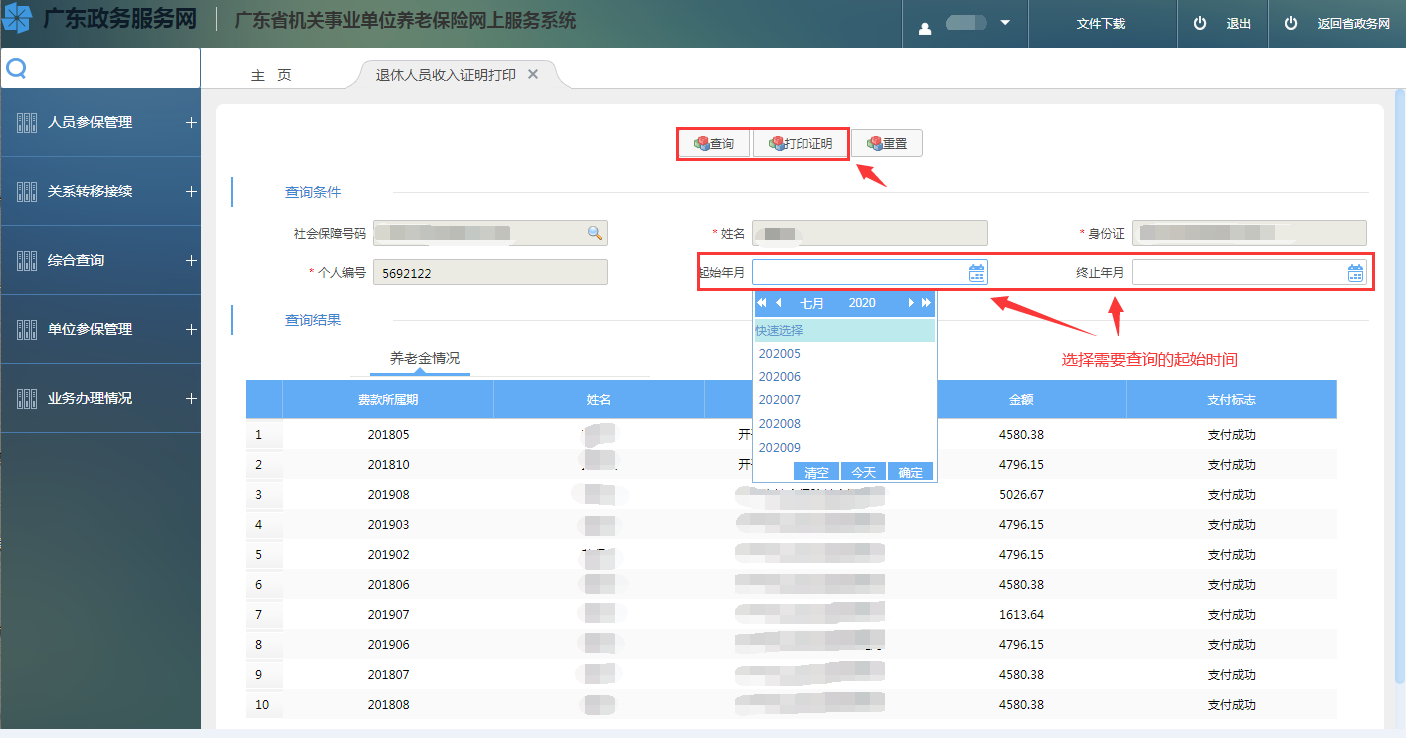查詢打印路徑:綜合查詢→退休人員收入證明打印→社保號查詢→輸入起始和終止年月→導出打印
