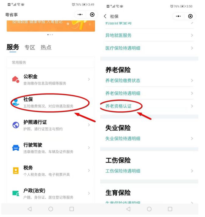 1.可辦理:企業(yè)職工養(yǎng)老保險(xiǎn)待遇資格認(rèn)證(即退休年審)業(yè)務(wù)。2.操作指引:參保人通過(guò)智能手機(jī)在微信上搜索“粵省事”小程序-在服務(wù)專(zhuān)區(qū)選擇“社保”板塊-點(diǎn)擊“登錄”,通過(guò)個(gè)人身份認(rèn)證后,選擇“養(yǎng)老保險(xiǎn)”-點(diǎn)擊“養(yǎng)老資格認(rèn)證”-點(diǎn)擊“城鎮(zhèn)職工社保”-點(diǎn)擊“本人辦理”或“為他人代辦”,并輸入對(duì)應(yīng)的姓名和身份證號(hào)碼-進(jìn)行人臉識(shí)別認(rèn)證。
