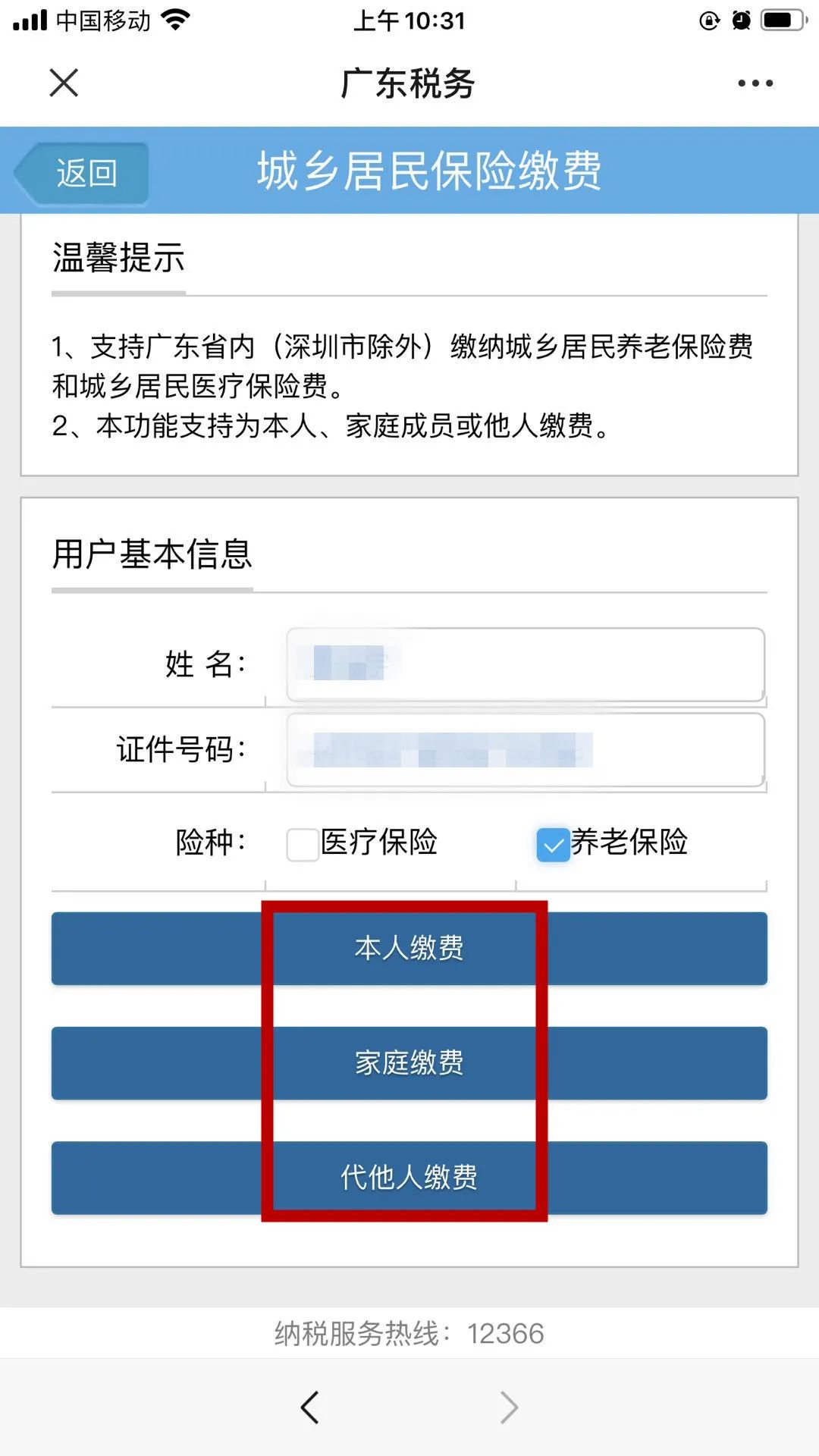 選擇“本人繳費”“家庭繳費”“代他人繳費”。