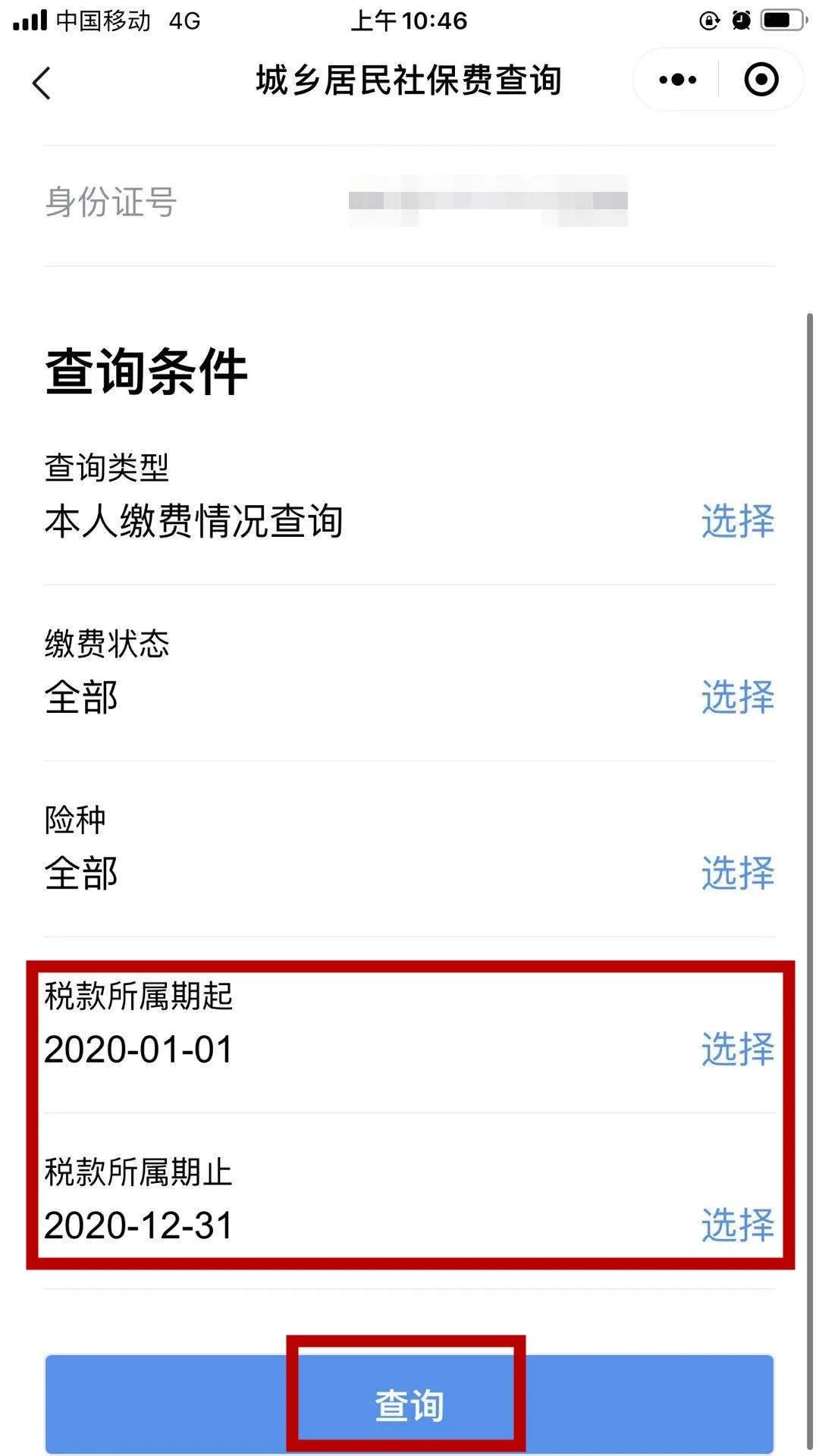認證完成后,點擊城鄉居民社保,選擇城鄉居民社保費查詢,選擇險種、所屬期起止日期,即可查詢。