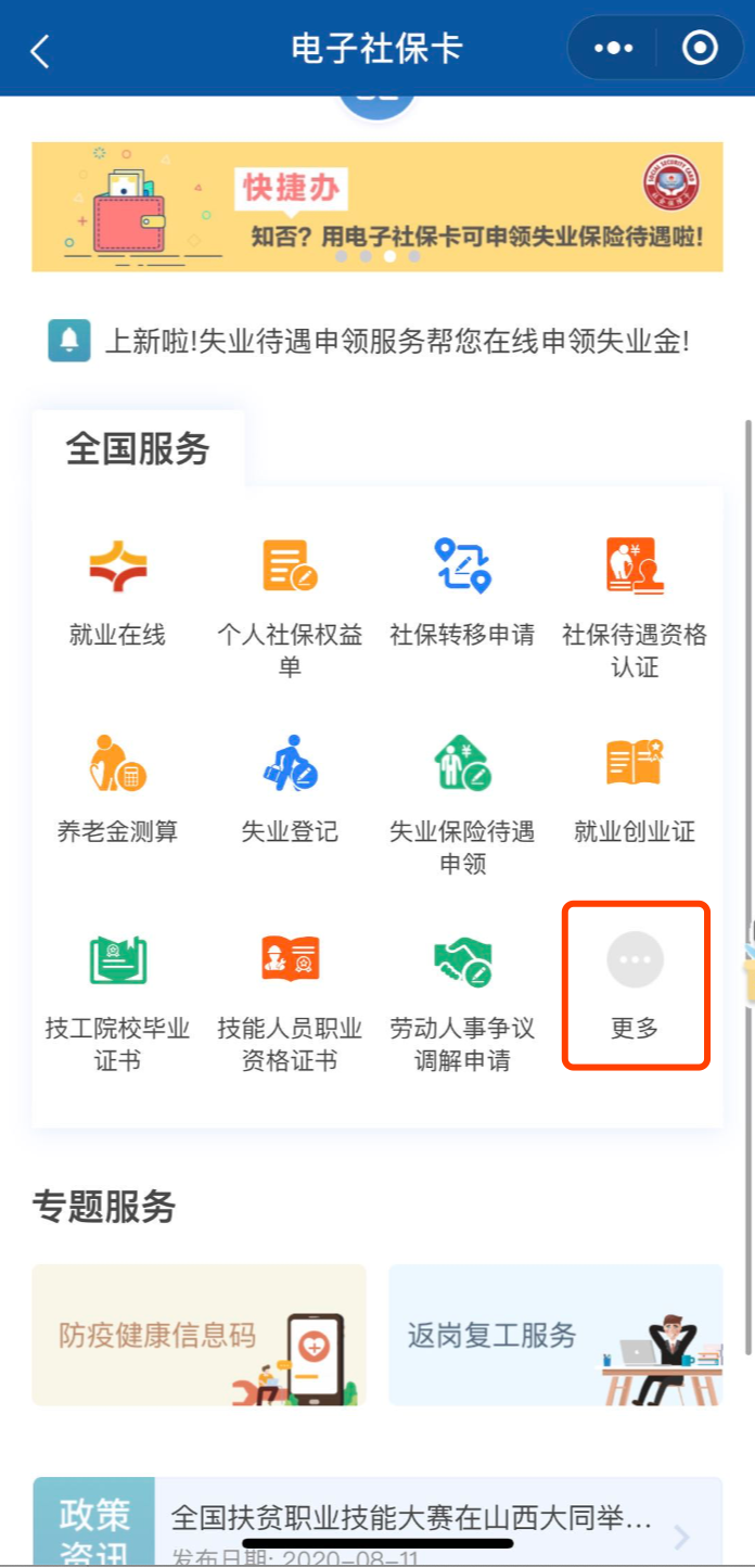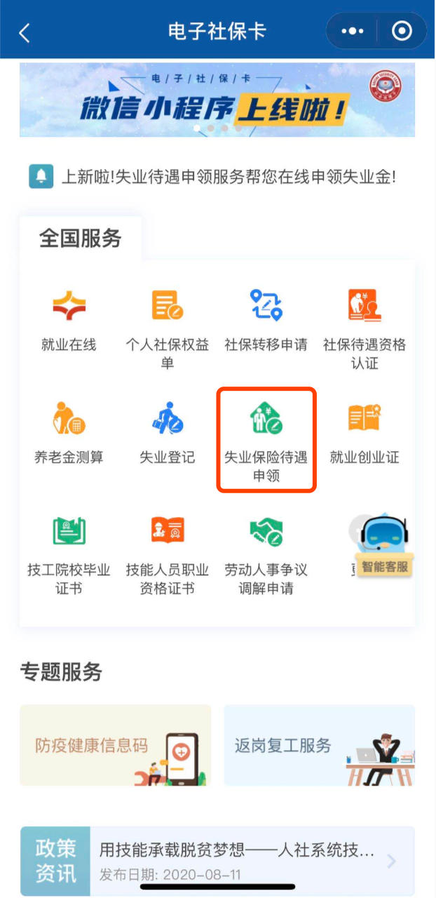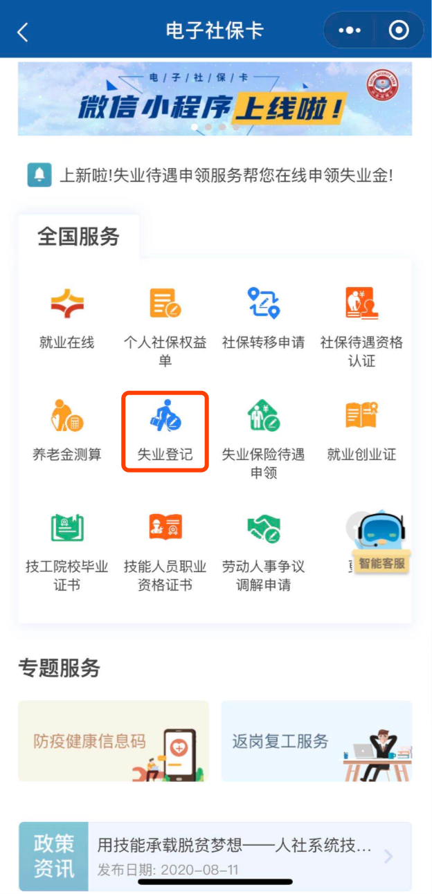 關于【失業登記】 Q 哪些人可以辦理失業登記? 所有勞動年齡內、有勞動能力、有就業需求、處于無業狀態的城鄉勞動者均可以進行失業登記。 例如,從各類學校畢業肄業的學生、與企業解除或終止勞動關系的勞動者、承包土地被征用的農民、從事一定收入的勞動但月收入低于當地最低生活保障標準的人員等。 Q 失業登記怎么辦理? 1 進入【國務院客戶端小程序】→【電子社保卡】→【查看電子社??ㄐ畔ⅰ?。 2 點擊失業登記,填寫申請人基本信息、失業相關信息和求職相關信息。 3 在【全國服務】→【更多】→【失業登記審核結果】中,可查詢之前提交申請的審核結果。 關于【失業保險待遇申領】 Q 哪些人可以領失業保險金、失業補助金? 失業保險金: 按規定參加失業保險,所在單位和本人已履行繳費義務滿1年、非本人意愿中斷就業、已辦理失業登記并有求職要求的失業人員。 失業補助金: ● 按規定參加失業保險,所在單位和本人已履行繳費義務不足1年的失業人員, ● 參保繳費滿1年但因個人原因解除勞動合同的失業人員, ● 領取失業保險金期滿仍未就業的失業人員。 Q 失業保險金、補助金怎么申領? 1 進入【國務院客戶端小程序】→【電子社???/a>】→【查看電子社保卡信息】。 2 點擊失業保險待遇申領,查詢所申領參保地是否開通失業保險金或失業補助金網上申領服務。目前全國所有省(區、市)失業保險金和失業補助金均已開通統一申領服務。 3 凡已開通服務的地區,可以點擊失業保險金或失業補助金“去申請”按鈕,核實或錄入參保地、銀行賬號等信息,就能完成申請。 4 點擊失業保險金或失業補助金“查看詳情”按鈕,可以查詢申請的審核結果。經核查符合申領條件的,就可以通過登記的銀行賬戶領到失業保險待遇啦。 掃描或點擊下方小程序碼, 領失業保險金、失業補助金