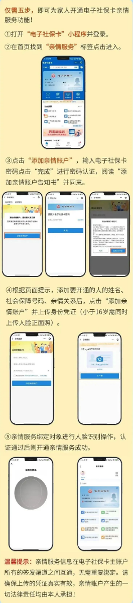 電子社保卡親情服務是為孩子、父母或其他家人,提供便捷的電子社保卡簽發和應用服務。親情服務所開通的功能與家人獨立申請電子社保卡基本一致,可以幫家人查詢個人社保權益單、社保待遇資格認證等等。
