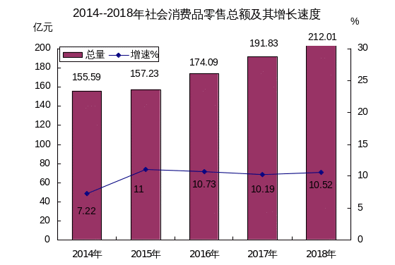 全年社會消費品零售總額212.01億元,比上年增長10.52%。按行業分,批發和零售業實現零售額189.16億元,比上年增長10.65%;住宿和餐飲業實現零售額22.85億元,比上年增長9.44%。其中:限額以上貿易企業實現零售額40.94億元,比上年增長5.62%。