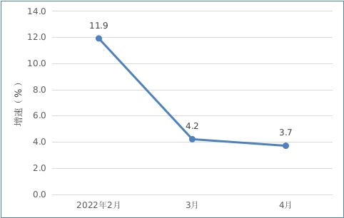 2022年2月以來我市規模以上工業增加值情況 二、投資 1-4月,全市完成固定資產投資同比下降2.9%。從分經濟類型看,國有投資增長49.3%;民間投資下降2.6%。分產業看,第一產業投資下降18.7%;第二產業投資增長8.9%,其中工業投資增長8.9%;第三產業投資下降9.8%,其中房地產投資下降28.4%。 三、消費市場 1-4月,我市完成社會消費品零售總額54.96億元,同比增長2.5%。 圖二