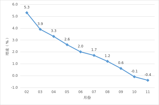 1-11月,全市主要經濟指標運行簡況如下: 一、工業生產 1-11月,開平規模以上工業企業累計完成工業增加值119.82億元,同比增長2.5%。 分經濟類型看,股份制企業增長8.0%;外商及港澳臺商投資企業下降2.3%;私營企業增長3.7%。分門類看,采礦業增加值下降28.0%,制造業增加值增長1.5%,電力、熱力、燃氣及水生產和供應業增加值增長77.2%。 圖一 2024年2月以來開平市規模以上工業增加值增速 二、投資 1-11月,全市完成固定資產投資同比增長1.5%。分經濟類型看,國有投資下降23.0%,民間投資下降2.8%。分產業看,第一產業投資下降57.9%;第二產業投資增長2.2%,其中工業投資增長2.2%;第三產業投資增長3.7%,其中房地產投資下降11.3%。 三、消費市場 1-11月,我市完成社會消費品零售總額171.55億元,同比下降0.4%。 圖二 2024年2月以來開平市社會消費品零售總額增速 四、財政收入 1-11月,全市實現地方一般公共預算收入26.95億元,同比下降1.1%,其中稅收收入14.01億元,同比下降7.1%。 五、金融市場 11月末,全市金融機構本外幣各項存款余額1009.31億元,同比增長9.4%;本外幣各項貸款余額720.44億元,同比增長8.6%。 六、外貿進出口 1-11月,全市外貿進出口總額148.9億元,同比增長7.3%。其中,進口13.9億元,同比增長19.1%;出口135.0億元,同比增長6.2%。