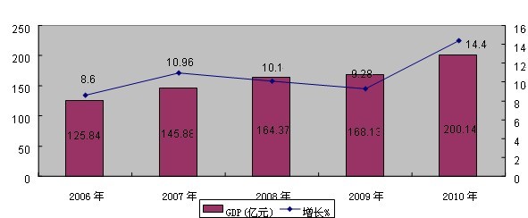 2010年,全市國民經濟繼續保持健康發展,經濟增長速度適度加快,經濟運行質量明顯提高。初步核算全年實現生產總值200.14億元(當年價),比上年增長14.4%。其中:第一產業增加值20.09億元,增長4.2%;第二產業增加值103.66億元,增長20.5 %;第三產業增加值76.39億元,增長9.0%。第一、二、三產業增加值的比重為10.0 : 51.8 : 38.2。按戶籍人口計人均生產總值29105元。