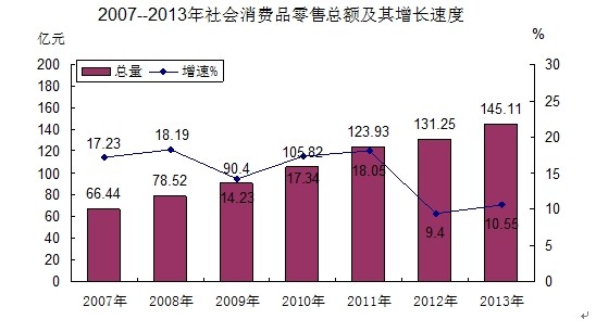全年社會消費品零售總額145.11億元,比上年增長10.55%。其中:城市消費品零售額101.74億元,比上年增長11.87%;農村消費品零售額43.37億元,比上年增長7.58%。