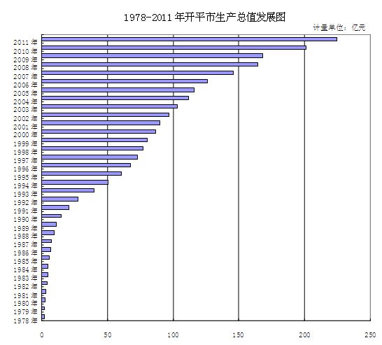改革開放三十多年,開平市經濟以跨越式發展的態勢,經濟總量不斷壯大。2011年我市生產總值是224.84億元,其總量是1978年的119倍。從1978年改革開放到2011年的34年間地區生產總值的年均增長速度是15.61%。其發展經歷了以下三個階段的跨越增長(見圖1)。第一次跨越:于1989年,創造出經濟總量超10億元,總量達到11.21億元,比1978年翻了5倍,1978年至1989年的年均增長率是17.67%;第二次跨越:于2003年,創造出經濟總量超100億,總量達到103.05億元,比1989年翻了8倍,1990年至2003年的年均增長率是18.60%;第三次跨越:于2010年,創造出經濟總量超200億,總量達到201.14億元,比2003年翻了1倍,2004年至2010年的年均增長率是10.03%。