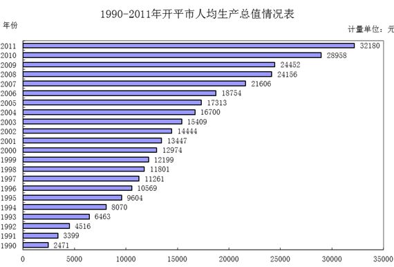 人均地區生產總值是衡量一個地區收入水平的標志,也是作為劃分經濟發展階段的重要指標。根據江門統計年鑒1990年以來開平市的常住人口數據為計算人均地區生產總值起點,計算結果顯示:我市人均生產總值呈逐年遞增的穩步增長態勢發展(見圖2)。2011年我市人均地區生產總值達到32180元,是1990年2471元的12倍,年均增長13%,比同期地區生產總值年均增長速度低0.77個百分點。根據1990—2011年的計算結果推算得出:我市用19年時間創造出人均生產總值超萬元,在1996年達到10569元,然后再用12年時間創造出人均生產總值翻一番,在2007年達21606元。