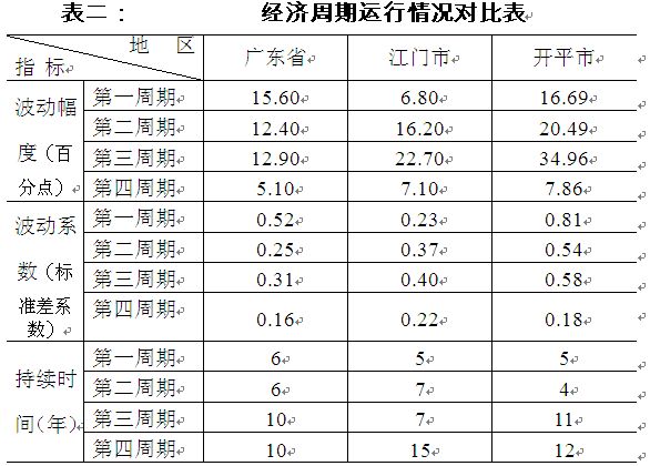 我市經濟周期呈現前快后穩的總體特征。我市經濟在改革開放初期發展較快,在第一周期快起快落,波動系數達0.812,在第二周期后表現更為快速,歷時4年完成峰谷位交替,但波動系數下降到0.54;第三周期則受鄧小平同志南巡以及撤縣設市帶動一大批重點項目投入上馬等促進,波動系數比第二周期上升0.044,達0.584;在第四周期的發展,則有所放緩但表現平穩,波動系數下降到0.179。具體見表一和表二: