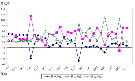 1978—2011年,開平市三次產業對生產總值的貢獻率均值分別是:第一產業15.22%、第二產業43.95%、第三產業40.83%,具體表現如下:第一產業對經濟的貢獻由高到低發展。在改革開放初期對經濟的貢獻達40%以上,由1985年開始呈波動向下發展至2011年其貢獻率只有6.5%;第二產業對經濟的貢獻由小到大。其在改革開放初期的貢獻率只有20%左右,但隨著改革開放的深入推進,尤其在工業經濟的快速發展推動下逐漸成為主導產業,2011年對經濟的貢獻率達70.94%;第三產業對經濟的貢獻波動不穩。在改革開放三十多年中,第三產業呈與第二產業互補交替的合力之勢對經濟發展作出貢獻。具體見圖4: