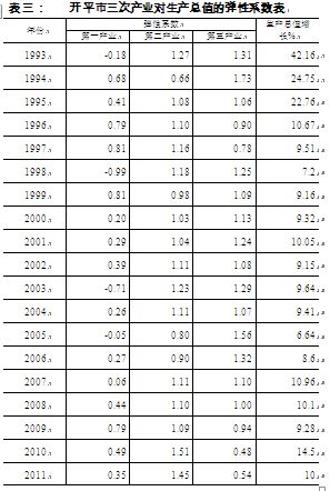 以開平市1993年—2011年的三次產業的增長速度,計算出其對生產總值增長的彈性系數,計算結果是:第一產業的彈性系數較小;第二產業的彈性系數高且較穩定;第三產業的彈性系數整體較高,但在2006年開始受金融風暴影響對經濟的彈性系數逐步下降。具體見表三: