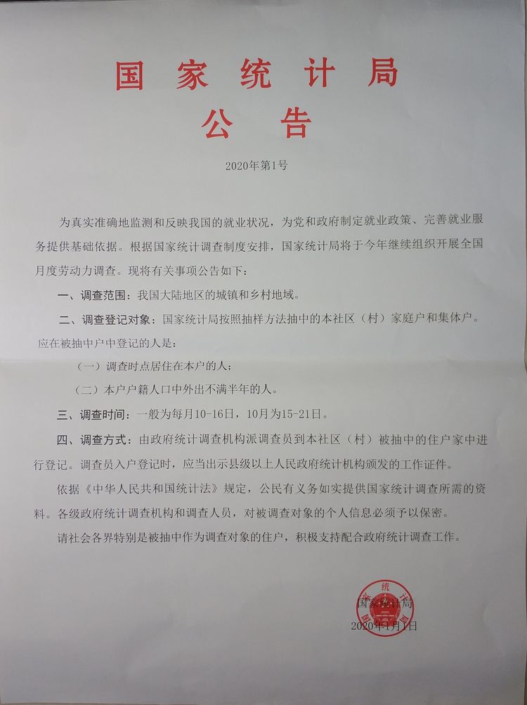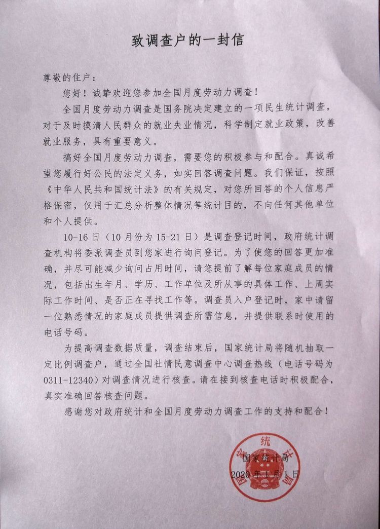 尊敬的住戶: 您好!誠摯歡迎您參加全國月度勞動力調查! 全國勞動力調查是國務院決定建立的一項關乎民生的政府統計調查,對于及時摸清人民群眾的就業失業情況,科學制定就業政策,改善就業服務,具有重要意義。 搞好全國月度勞動力調查,需要您的積極參與和配合。真誠希望您履行好公民的法定義務,如實回答調查問題。我們保證,按照《中華人民共和國統計法》的有關規定,對您所回答的個人信息嚴格保密,僅用于分析整體情況等統計目的,不向其他單位和個人提供。 每月10-16日是調查員登記時間,政府統計調查機構將委派調查員對您進行詢問登記。目前由于新冠肺炎疫情防控常態化,為減少人員聚集,保障調查員和群眾安全,采取提前預約的方式,對被抽中調查社區住戶分別提前預約電話訪問時間,并采用電話訪問與入戶訪問的方式進行調查。 為了使您回答的內容更加準確,并盡可能少地占用您的時間,請您提前了解家庭中每一位家庭成員的基本情況,包括出生年月、學歷、工作單位及所從事的具體工作、上周(3-9日)實際工作時間、是否正常尋找工作及疫情對就業的影響等。調查員電話訪問或入戶訪問登記時,請讓家中一位熟悉情況的家庭成員提供調查所需信息。 為提高調查數據質量,調查結束后,國家統計局將從調查戶中隨機抽取一定比例,通過全國社情民意調查中心調查熱線(電話號碼為:010-12340)對調查情況進行核查。請在接到核查電話時積極配合,真實準確回答核實問題。 感謝您對政府統計和全國月度勞動力調查工作的支持和配合! 開平市統計局(電話:0750-2268540) 2021年3月1日