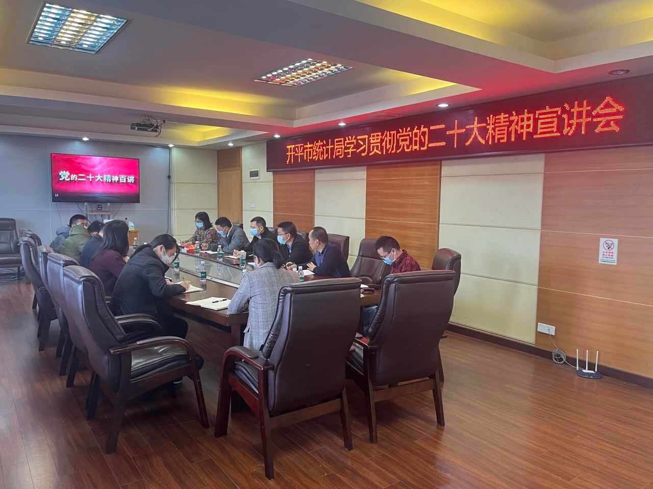 開平市統計局召開學習貫徹黨的二十大精神宣講會 為深入推進黨的二十大精神的學習,進一步落實全面從嚴治黨要求,2月1日開平市統計局召開學習貫徹黨的二十大精神宣講會,局全體黨員參加。 宣講會首先以視頻方式組織收看了國家統計局“全面從嚴治黨”專題講座,中央紀委國家監委駐委紀檢監察組二級巡視員劉桂紅作了專題輔導。隨后黨組書記、局長李健鵬同志主持集體學習。與會班子成員圍繞黨的二十大提出的新目標、新方略、新任務、新舉措,立足統計部門職能,就如何提高統計數據質量、強化經濟形勢分析研判、扎實做好各項統計調查和提高優質統計服務等內容進行了交流發言。 通過宣講學習,全體黨員進一步加深了對習近平新時代中國特色社會主義思想和黨的二十大精神的理解和把握,明確了新一年的工作目標,達到了相互啟發,促進落實的目標。