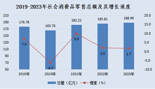 全年社會消費品零售總額188.99億元,比上年增長1.7%。其中:限額以上貿易單位實現社零43.50億元,比上年下降6.2%。在限額以上批發和零售業商品銷售額中糧油、食品、飲料、煙酒類比上年增長44.6%服裝、鞋帽、針紡織品類下降7.6%,化妝品類下降4.2%,金銀珠寶類下降12.8%,日用品類下降4.4%,體育、娛樂用品類下降49.1%,書報雜志類增長8.5%,家用電器和音像器材類增長4.1%,中西藥品類下降6.9%,文化辦公用品類下降9.4%,石油及制品類增長0.6%,汽車類下降0.8%。全年全市限額以上批零企業通過公共網絡實現的商品零售下降17.9%占全市限額以上批零企業商品零售的1.0%