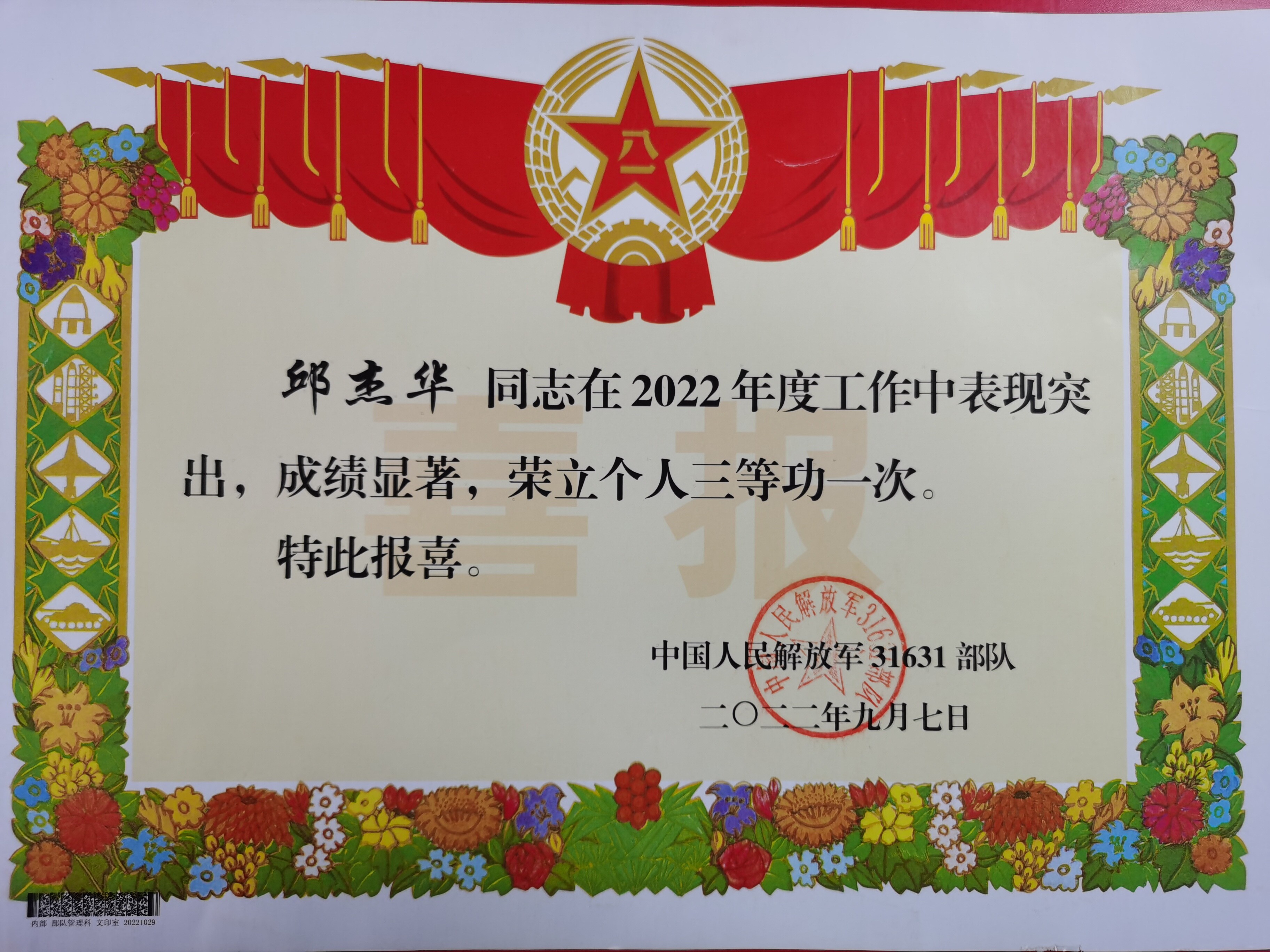 據了解,邱杰華同志于2014年9月入伍,服役于中國人民解放軍陸軍,自入伍以來,他始終堅持錘煉本領,爭做精武尖兵,因訓練工作突出,多次獲得“四有”優秀士兵榮譽和嘉獎,此次在2022年備戰訓練成績突出,榮獲三等功榮譽,這些都是邱杰華同志,一步一個腳印,扎扎實實奮斗而來。