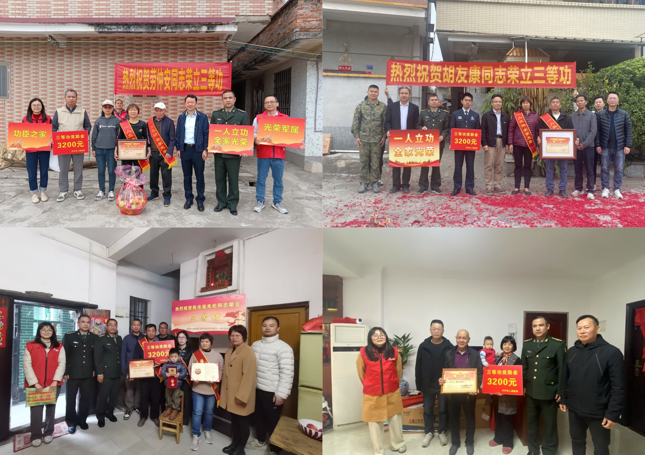 2024年度,開平籍現役軍人勞仲安、吳兆倫、胡友康、周展業、羅偉成、司徒和順,因在部隊表現突出,榮立個人三等功。近日,開平市退役軍人事務局、開平市人民武裝部和屬地武裝部及退役軍人服務站一行組成報喜團,分別為6名在部隊立功的現役軍人家庭送去喜報和慰問金,以表彰他們在國防和軍隊建設中的突出貢獻,同時向軍人家庭表達誠摯的感謝和崇高的敬意。
