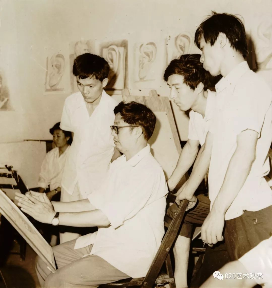 胡鉅湛,開平籍藝術家,擅長水彩畫、油畫。任教于廣州美術學院,曾任教育系主任、教授、碩士生導師,兼任廣東教育學院美術系主任、教授,為二系的創建人。中華人民共和國全國中、小學美術科教材審查委員會委員、中國美術家協會會員、廣東省文史館館員、廣東水彩畫藝術委員會副主任、廣東水彩畫研究會副會長等職。 胡鉅湛老師口述史采訪現場。龍成關攝 廣州美院“987口述史工程” 胡鉅湛老師訪談信息 受訪人:胡鉅湛老師(長子胡赤駿老師協助) 采訪時間:2018年6月12日 采訪地點:廣州美術學院胡鉅湛老師家中 采訪者:許俏文 攝像:文三原、龍成關、何銘迄 音視頻總時長:180分鐘 胡鉅湛老師與口述史采訪團隊合影。龍成關攝 胡鉅湛訪談文字摘錄 如何走上藝術道路? 我從小到大都是在玩的,畫畫也是在玩的。我感覺那個年代的年輕人跟現在不一樣,我們那個年代都是喜歡玩,現在是老師怎么講就怎么做,現在的要求太多。那個年代小孩都是在玩,那個魚、那個風景也是玩出來的。怎么讓它們動起來,就要有想象,這個不容易。(在開平一中的時候),(胡根天)是我的老師。我那個時候,在學習這個階段,沒有人教也沒有人說,我們都是自己動手動腳,自己在那里玩。我好多畫都是動手實踐出來的。如果搞不清楚、講不清楚就動起來,慢慢就能感覺到是這么回事。后來才學會畫畫的,這整個過程我都是玩過來的。 采訪中,胡鉅湛老師長子胡赤駿老師向采訪者展示胡赤駿早年學畫期間曾用過的水彩顏料。龍成關攝 (胡赤駿補充)他說的意思大概就是那個時候只有在真實的生活里面玩,才有那種體驗。他畫風景、畫魚,都是在玩。他的意思就是說要接觸真實的生活。 熱帶魚 水彩 39cm×54cm 1980年 “魚跟我們有感情” 我覺得魚跟我們有感情,魚可以幫我們想很多東西,魚動起來,很多變化是你想不到的。會引起共鳴,跟人的心有聯系。魚在水里玩啊玩啊,靠水來表現,水有多少,出來的效果都不一樣。魚比較活躍,容易表現出來。畫魚,有光線就顯得很豐富,好多人都體會不到。要掌握這個水的性能和光線,要做到心中有數,要讓水聽你的話,聽你“指揮”。我可以利用這個光線的變化,表現色彩什么時候淺,什么時候深。畫魚時,有些時候是在水上面做功夫,有些時候是在水的表現上,它們的效果是不同的。 1958年胡鉅湛與陳秀莪在武漢中南美專結婚,婚后因為學校工作安排,胡鉅湛隨學校去廣州參與組建廣州美術學院,陳秀莪趕回湖北珠基農場 藝術伉儷 (胡赤駿講述)他們(胡鉅湛和陳秀莪)畫畫主要分三種類型:一個是習作,習作一般給學生示范畫的,是有對象的一種畫法;再一個就是他們帶學生下鄉寫生,我覺得他們當時下鄉寫生是很自在的,畫了很多很漂亮的作品;然后,就進入到后來那個階段,他們自己慢慢摸索到了一個題材,一些做法。像我母親,她就是以花為主,畫花。他們兩人都畫魚,兩個人在技法上有切磋,互相都有一些“小發明”。比方說,他的畫里面魚的那種氣泡,是我母親發明的。她用酒精滴在畫作上,然后產生了像氣泡一樣的那種感覺,他就用上了,他們在技法上相互借用,但題材不一樣。 教學示范 組創廣美教育系 (胡赤駿講述)他(胡鉅湛)是(20世紀)80年代末去組創廣州美院教育系的,以前叫師范系,培養專門的美術老師。他去做了三次調研,都有詳細的筆記。第一次是全國素描研討會的調研,第二次是為了師范教育的調研。后來就是為了水彩教育,水彩這個專業的教學記錄。這三次都有很詳細的筆錄,最后就成立了這個師范系。這個師范專業在當時是全國第一個正式的水彩教育專業,他也是第一個在全國招水彩專業研究生的人。 教學 “三小時作畫” 以前和現在肯定是有變化的,都不一樣。比如有些東西用來表現魚可以,但是表現別的就不行。如果畫的是很結實的東西,比如金屬,它就沒辦法體現。有些畫法只適合一種題材,總不能說讓所有人都去畫魚。平常畫水彩要想很多辦法來表現水的變化,材料的變化也多種多樣。平常畫一張畫要畫三小時,但我畫的時間就可以比較短。 我們拜訪顏文粱老師 (胡赤駿講述)他所說的“三個小時”,指的是一張紙弄濕了以后,基本上三個小時就會干了。紙干了以后你再畫,它就生硬了,就會出現硬邊,很生硬的感覺。所以他要在三小時沒干之前,讓顏色都能融在一起。 寫生 我觀察過他畫畫,現在這個時候是他畫畫最好的時候,因為濕度大。下大雨,濕度就很大,他這個時候畫畫成功率就很高。因為畫紙干的時間相對比較長,他有更多的時間去調整,所以這個畫和天氣有很大關系。 水彩畫研究會 我做過實驗,請他去“湖廬”,正好那個時候是北風天,他要畫一個東西他就畫不了,因為那個畫干得太快,所有東西他都操控不了。他畫畫是會受到客觀環境的影響的。我曾經想跟他在從化搞一個畫室,按照他要求的光線,那個空間里面可以控控制干濕度。曾經設想過,但是沒有做成。 北京展覽 1986年我在西雙版納寫生 魚水情 水彩 54cm×79cm 1984年 族群 水彩 54×79cm 1997年 幽蘭 水彩 39.7×54cm 1980年 黃斑魚 水彩 39.5×55cm 1982年 氣象萬千 水彩 54×79cm 2014年 如魚得水 水彩 54×79cm 2015年