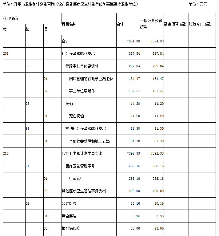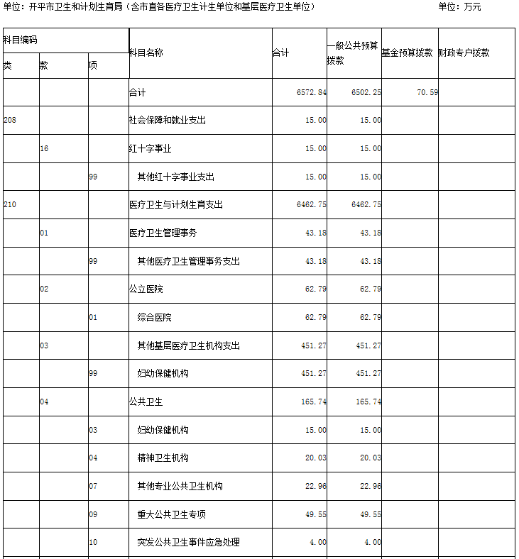2014 年度開平市衛(wèi)生和計劃生育局 決算公開 第一部分 2014年開平市衛(wèi)生和計劃生育局決算基本情況說明 一、部門基本情況 (一)部門機構設置、職能 開平市衛(wèi)生和計劃生育局是主管開平市衛(wèi)生計生工作的職能部門。主要職能: 1、貫徹執(zhí)行國家、省和江門市有關衛(wèi)生和計劃生育、中醫(yī)藥工作的法律法規(guī)和方針政策以及市委市政府有關工作部署,擬訂衛(wèi)生和計劃生育以及促進中醫(yī)藥事業(yè)發(fā)展的規(guī)劃。負責協(xié)調推進我市醫(yī)藥衛(wèi)生體制改革和醫(yī)療保障,統(tǒng)籌規(guī)劃衛(wèi)生和計劃生育服務資源配置,指導區(qū)域衛(wèi)生和計劃生育規(guī)劃的編制和實施。 2、負責疾病預防控制工作,協(xié)調有關部門對重大疾病實施防控與干預,組織實施免疫規(guī)劃工作。制定衛(wèi)生應急和緊急醫(yī)學救援預案、突發(fā)公共衛(wèi)生事件監(jiān)測和風險評估計劃,組織和指導突發(fā)公共衛(wèi)生事件預防控制和各類突發(fā)公共事件的醫(yī)療衛(wèi)生救援。報送突發(fā)公共衛(wèi)生事件應急處置信息。組織開展食品安全風險監(jiān)測、評估和交流。 3、組織開展職業(yè)衛(wèi)生、放射衛(wèi)生、環(huán)境衛(wèi)生、學校衛(wèi)生、公共場所衛(wèi)生、飲用水衛(wèi)生管理的檢測、調查、評估和監(jiān)督,負責傳染病防治監(jiān)督。 4、負責組織擬訂基層衛(wèi)生和計劃生育服務、婦幼衛(wèi)生發(fā)展規(guī)劃和政策措施,指導全市基層衛(wèi)生和計劃生育、婦幼衛(wèi)生服務體系建設,推進基本公共衛(wèi)生和計劃生育服務均等化,完善基層運行新機制和鄉(xiāng)村醫(yī)生管理制度。 5、負責醫(yī)療機構和醫(yī)療服務的行業(yè)準入管理并監(jiān)督實施。落實醫(yī)療機構及其醫(yī)療服務、醫(yī)療技術、醫(yī)療質量、醫(yī)療安全以及采供血機構管理的規(guī)范、標準,實施衛(wèi)生專業(yè)技術人員準入、資格標準,制定和實施衛(wèi)生專業(yè)技術人員執(zhí)業(yè)規(guī)則和服務規(guī)范,建立醫(yī)療機構醫(yī)療服務評價和監(jiān)督管理體系。 6、負責組織推進公立醫(yī)院改革,建立公益性為導向的績效考核和評價機制,建設和諧醫(yī)患關系,提出醫(yī)療服務和藥品價格政策的建議。 7、組織實施國家藥物政策和基本藥物制度,提出基本藥物價格政策的建議。 8、貫徹落實國家生育政策,完善生育管理政策,組織實施促進出生人口性別平衡的政策措施,組織監(jiān)測計劃生育發(fā)展動態(tài),提出發(fā)布計劃生育安全預警預報信息建議。組織實施計劃生育技術服務管理制度。組織實施優(yōu)生優(yōu)育和提高出生人口素質的政策措施,推動實施計劃生育生殖健康促進計劃,降低出生缺陷人口數量。 9、組織建立計劃生育利益導向、計劃生育特殊困難家庭扶助和促進計劃生育家庭發(fā)展等機制。負責協(xié)調推進有關部門、群眾團體履行計劃生育工作相關職責。 10、負責衛(wèi)生和計劃生育信息化建設,加強全員人口信息系統(tǒng)建設,參與全市人口基礎信息庫建設。 11、組織落實流動人口計劃生育服務管理制度,推動建立流動人口流入地、流出地衛(wèi)生和計劃生育信息互聯(lián)互通和公共服務工作機制。 12、組織擬訂全市衛(wèi)生和計劃生育人才發(fā)展規(guī)劃,指導衛(wèi)生和計劃生育人才隊伍建設。加強全科醫(yī)生等急需緊缺專業(yè)人才培養(yǎng),建立完善住院醫(yī)師和專科醫(yī)師規(guī)范化培訓制度并指導實施。 13、組織擬訂衛(wèi)生和計劃生育科技發(fā)展規(guī)劃,組織實施衛(wèi)生和計劃生育相關科研項目。協(xié)同指導院校醫(yī)學教育和計劃生育教育,組織實施畢業(yè)后醫(yī)學教育和繼續(xù)醫(yī)學教育。 14、指導鎮(zhèn)村衛(wèi)生和計劃生育工作,完善綜合監(jiān)督執(zhí)法體系,規(guī)范執(zhí)法行為,監(jiān)督檢查法律法規(guī)和政策措施的落實,組織查處重大違法行為。組織實施人口與計劃生育目標管理責任制的考評工作。監(jiān)督落實計劃生育一票否決制。 15、負責衛(wèi)生和計劃生育宣傳、健康教育和健康促進等工作,依法組織實施統(tǒng)計調查。組織指導交流合作與援外工作,開展與港澳臺的交流與合作。 16、承擔市愛國衛(wèi)生運動委員會、市深化醫(yī)藥衛(wèi)生體制改革工作領導小組和市人民政府防治艾滋病工作委員會的日常工作,負責市重大活動與重要會議的醫(yī)療衛(wèi)生保障工作。 17、承辦市人民政府、上級衛(wèi)生和計劃生育部門交辦的其他事項。 現(xiàn)設11個內設機構。納入部門決算編制有27個(含下屬單位)行政(事業(yè))單位,包括:行政單位開平市衛(wèi)生和計劃生育局;事業(yè)單位開平市中心醫(yī)院、開平市第二人民醫(yī)院、開平市第三人民醫(yī)院、開平市婦幼保健院、開平市中醫(yī)院、開平市衛(wèi)生財務結算中心、開平市計劃生育服務站、開平市流動人口計劃生育管理服務中心、開平市皮膚防治站、開平市結核病防治所、開平市玲瓏醫(yī)院、開平市水口醫(yī)院、14家基層衛(wèi)生院。 (二)人員構成情況 開平市衛(wèi)生和計劃生育局公務員編制35人,雇員編制6人,目前實有公務員32人,雇員6人,離退休40人。下屬事業(yè)單位編制3084人,實