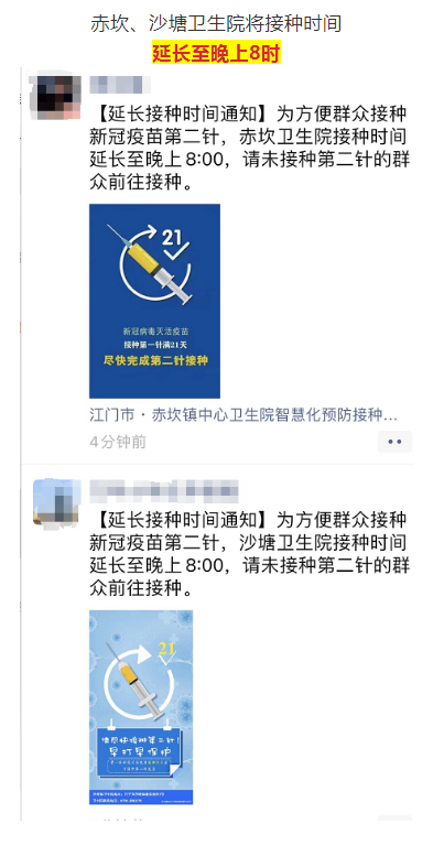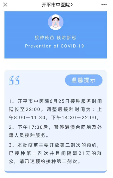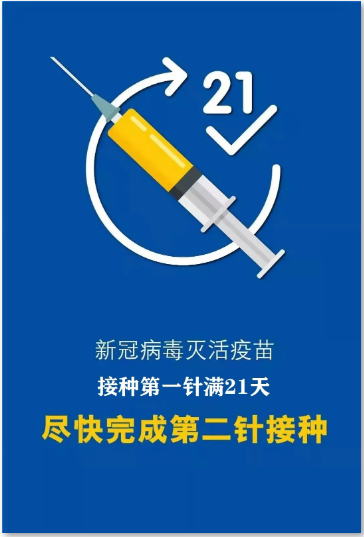 重要通知 廣大市民: 根據上級工作安排,我市將在6月底前完成本階段新冠疫苗第二劑次接種任務,清庫清零。請已接種第一針滿21天的廣大市民迅速到原接種點接種第二針。7月1日后新冠疫苗接種工作安排將會有調整。 為了確保已接種第一針滿21天的廣大市民能在6月底前完成接種第二針,實施錯峰接種,避免高峰期扎堆排隊,我市各疫苗接種點將向第一針次疫苗接種已滿21天的市民群眾發出提醒信息,收到信息的可在2天內免預約到該接種點接種。同時,也可以在每天晚上7點通過粵苗APP、粵健通微信小程序進行預約接種。 開平市衛生健康局 2021年6月24日 @廣大市民,請知悉 第一針尚未產生足夠免疫保護 要完成第二針后14天 才能在體內產生很好的中和抗體 如您已接種第一針新冠滅活疫苗 超滿21天 請迅速接種第二針以達到保護效果 開平市預防接種單位信息