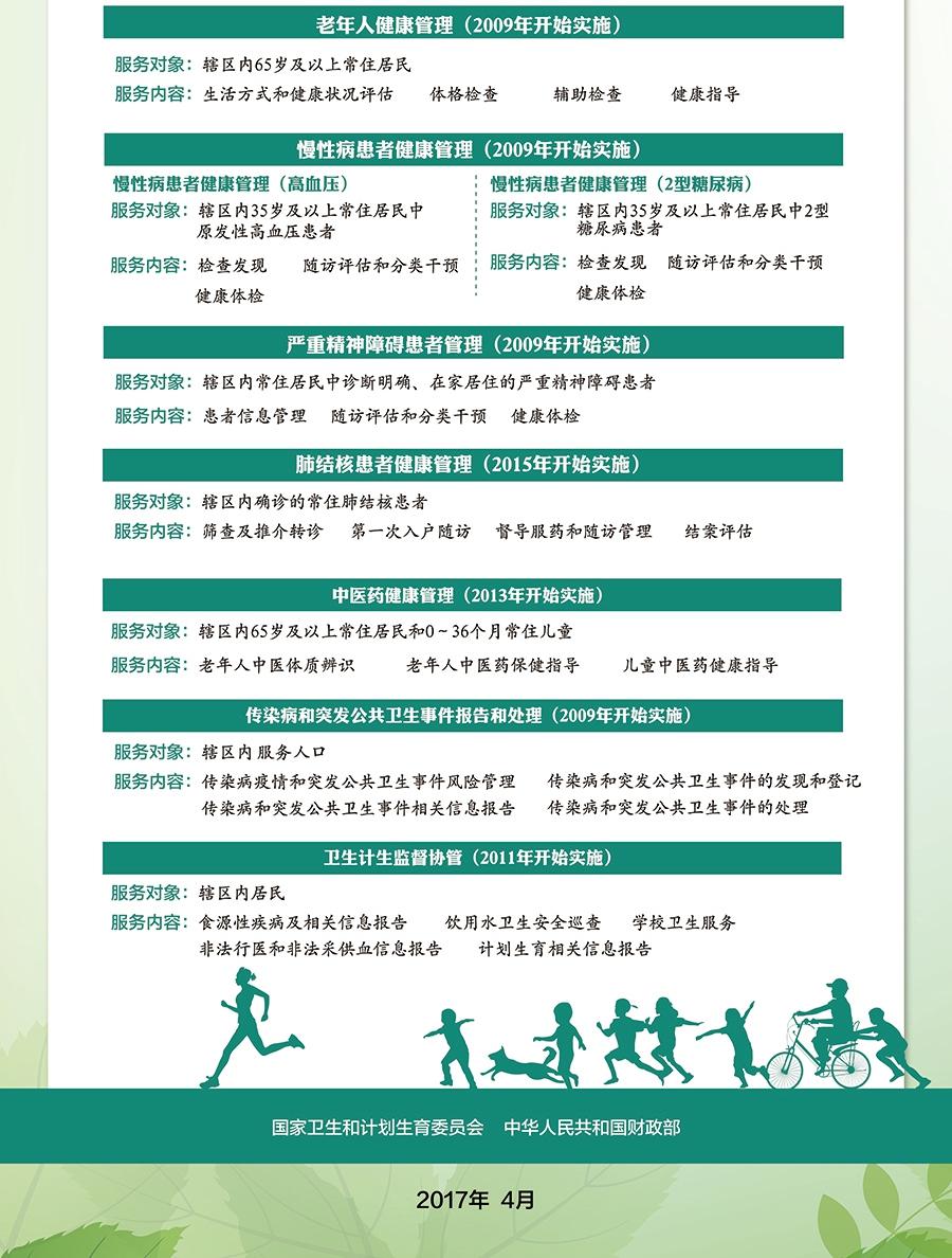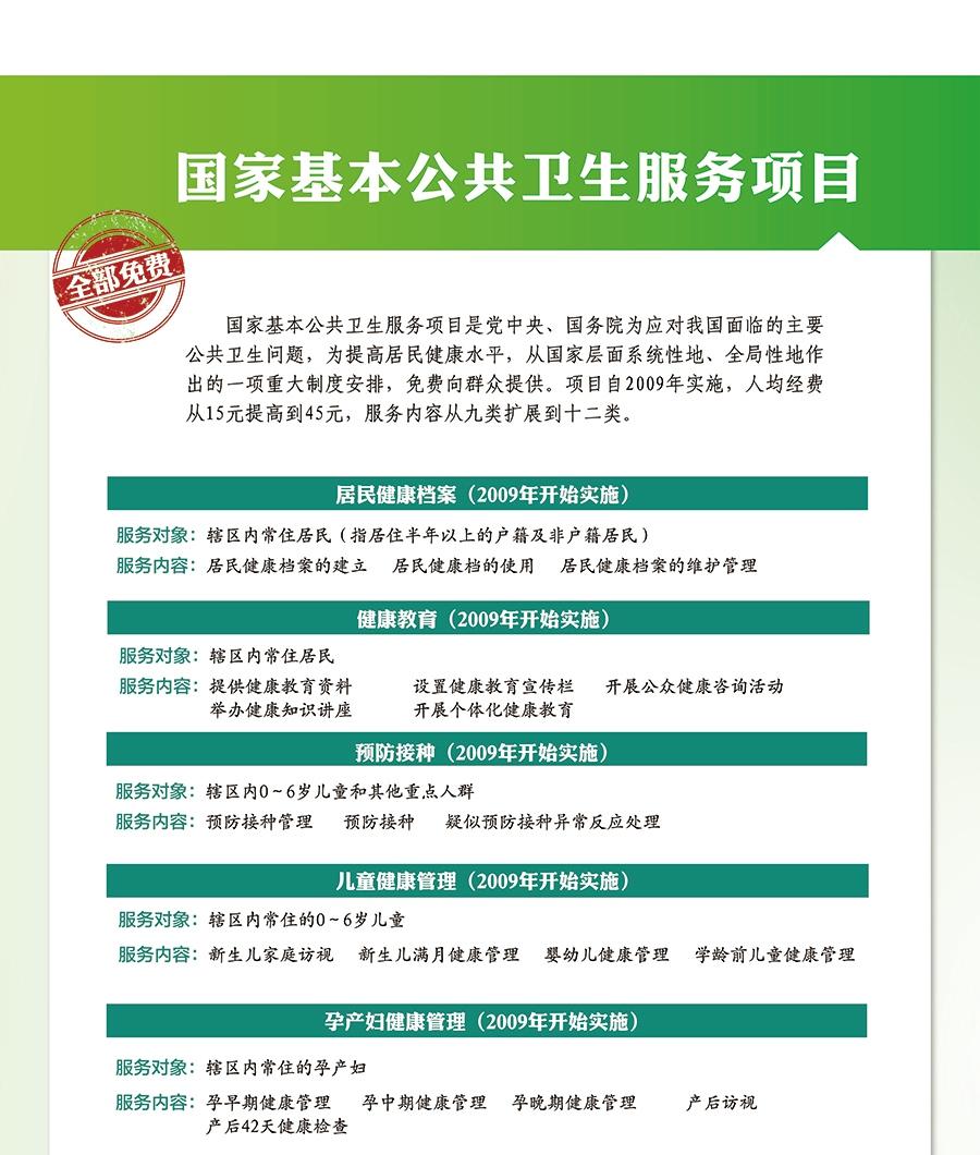 開平市免費提供國家基本公共衛生服務承擔機構信息公開 為進一步規范國家基本公共衛生服務項目管理,加強對項目實施的監督,現將開平市承擔公共衛生服務的醫療機構相關信息予以公示: 國家基本公共衛生服務項目一覽表 序號 類別 服務對象 項目及內容 一 建立居民健康檔案 轄區內常住居民,包括居住半年以上非戶籍居民 1.建立健康檔案2.健康檔案維護管理 二 健康教育 轄區內常住居民 1.提供健康教育資料2.設置健康教育宣傳欄3.開展公眾健康咨詢服務4.舉辦健康知識講座5.開展個體化健康教育 三 預防接種 轄區內0-6歲兒童和其他重點人群 1.預防接種管理2.預防接種3.疑似預防接種異常反應處理 四 兒童健康管理 轄區內常住的0-6歲兒童 1.新生兒家庭訪視2.新生兒滿月健康管理3.嬰幼兒健康管理4.學齡前兒童健康管理 五 孕產婦健康管理 轄區內常住的孕產婦 1.孕早期健康管理2.孕中期健康管理3.孕晚期健康管理4.產后訪視5.產后42天健康檢查 六 老年人健康管理 轄區內65歲及以上常住居民 1.生活方式和健康狀況評估2.體格檢查3.輔助檢查4.健康指導 七 慢性病患者健康管理(高血壓、2型糖尿病患者) 轄區內35歲及以上常住居民中原發性高血壓患者、2型糖尿病患者 1.檢查發現2.隨訪評估和分類干預3.健康體檢 八 嚴重精神障礙患者管理 轄區內常住居民中診斷明確、在家居住的嚴重精神障礙患者 1.患者信息管理2.隨訪評估和分類干預3.健康體檢 九 結核病患者健康管理 轄區內常住肺結核患者 1.篩查及推介轉診2.第一次入戶隨訪3.督導服藥和隨訪管理4.結案評估 十 中醫藥健康管理 轄區內65歲及以上常住居民和0-36個月兒童 1.老年人中醫體質辨識2.兒童中醫藥調養 十一 傳染病及突發公共衛生事件報告和處理 轄區內服務人口 1.傳染病疫情和突發公共衛生事件風險管理2.傳染病和突發公共衛生事件的發現和登記3.傳染病和突發公共衛生事件先關信息報告4.傳染病及突發公共衛生事件的處理 十二 衛生計生監督協管 轄區內居民 1.食源性疾病及相關信息報告2.飲用水衛生安全巡查3.學校衛生服務4.非法行醫及非法采供血信息報告5.計劃生育及相關信息報告 十三 免費提供避孕藥具 1.省級衛生計生部門作為本地區免費避孕藥具采購主體依法實施避孕藥具采購2.省、地市、縣級計劃生育藥具管理機構負責免費避孕藥具存儲、調撥等工作 十四 健康素養促進 1.健康促進縣(區)建設2.健康科普3.健康促進醫院和戒煙門診建設4.健康素養和煙草流行監測5.12320熱線咨詢服務6.重點疾病、重點領域及重點人群健康教育 開平市基本公共衛生服務承擔機構信息公開 機構名稱 機構地址 聯系電話 服務內容 三埠街道辦事處社區衛生服務中心(公共衛生服務科) 開平市荻海中和路272號 0750-2338189 詳見《國家基本公共衛生服務項目一覽表》 三埠街道辦事處社區衛生服務中心(長沙社區服務站) 開平市長沙東郊南區36號101 0750-2290699 三埠街道辦事處社區衛生服務中心(祥龍社區服務站) 開平市祥龍中路6號首層105-107 0750-2367639 三埠街道辦事處社區衛生服務中心(新昌社區服務站) 開平市新昌同興路25號 0750-2380392 三埠街道辦事處社區衛生服務中心(升平社區服務站) 開平市升平路38號1幢101 0750-2231826 水口醫院 開平市水口鎮中山路168號 0750-2737234 詳見《國家基本公共衛生服務項目一覽表》 月山鎮衛生院 開平市月山鎮彼迪大道35號 0750-2786662 沙塘鎮衛生院 開平市沙塘鎮康樂南街 0750-2881856 蒼城鎮衛生院 開平市蒼城鎮建新街1號 0750-2828727 龍勝鎮衛生院 開平市龍勝鎮西龍街24號 0750-2855991 大沙鎮衛生院 開平市大沙鎮康樂街1號 0750-2899214 馬岡鎮衛生院 開平市馬岡鎮人民街41號 0750-2877421 塘口鎮衛生院 開平市塘口鎮潭溪圩新潭路9、11號 0750-2671334 赤坎鎮衛生院 開平市赤坎鎮圩地街53號 0750-2626583 百合鎮衛生院 開平市百合鎮北郊34號 0750-2516223 蜆岡鎮衛生院 開平市蜆岡鎮興華路37號 0750-2522771 金雞鎮衛生院 開平市金雞鎮銀龍路33號 0750-2555346 赤水鎮衛生院 開平市赤水鎮中山路18號 0750-2577546 長沙街道辦事處社區衛生服務中心(公共衛生門診) 開平市長沙幕沙路94號 0750-2203635 提供咨詢服務 長沙街道辦事處社區衛生服務中心(幕橋門診) 開平市長沙幕沙路56號1棟 0750-2232779 1、定期一年一次老年人、高血壓、糖尿病、重性精神疾病健康體檢;2、提供慢病隨訪服務。 長沙街道辦事處社區衛生服務中心(祥苑門診) 開平市長沙祥苑北路1號1棟 0750-2278333 提供慢病隨訪服務 長沙街道辦事處社區衛生服務中心(僑園門診) 開平市長沙僑園路70號1棟 0750-2313203 1、定期一年一次老年人、高血壓、糖尿病、重性精神疾病健康體檢;2、提供慢病隨訪服務。 長沙街道辦事處社區衛生服務中心(樓崗門診) 開平市長沙樓崗樓新路3號 0750-2327474 1、定期一年一次老年人、高血壓、糖尿病、重性精神疾病健康體檢;2、提供慢病隨訪服務。 開平市衛生和計劃生育局 公共衛生股監督電話:0750-2221768 【 點擊進入查詢:開平市預防接種單位計免門診接種時間】 國家基本公共衛生服務項目推講 基本公衛十三項,都是免費多轉告! 每人每戶建檔案,健康管理有資料; 孕婦免費做檢查,母子平安最重要; 寶寶要打預防針,按時接種要記牢; 兒童體檢到六歲,兒保手冊要留好; 老人體檢每年有,查血心電加B超; 血壓血糖控制好,定期監測心