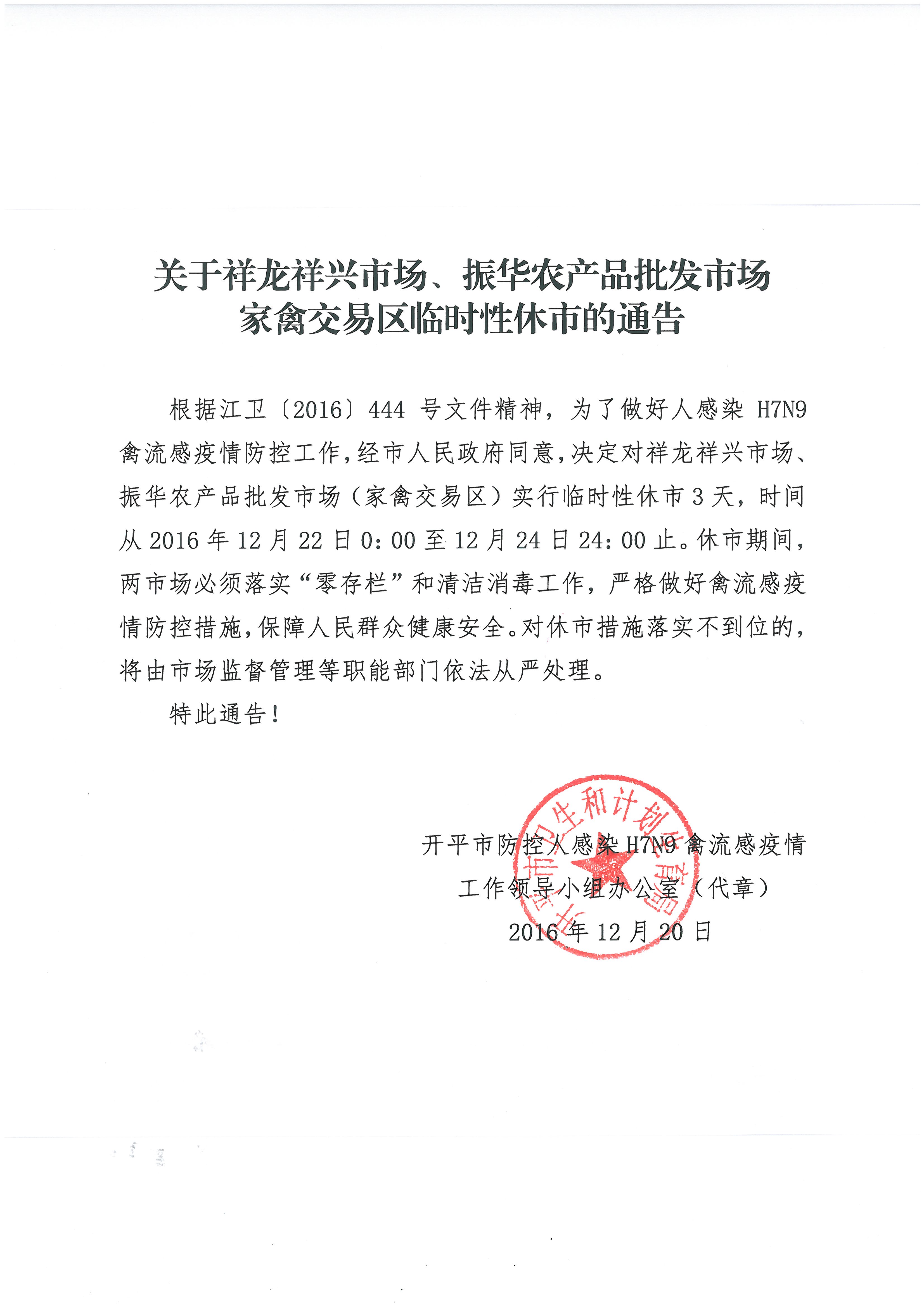 【休市通告】關于祥龍祥興市場、振華農產品批發市場家禽交易區臨時性休市的通告