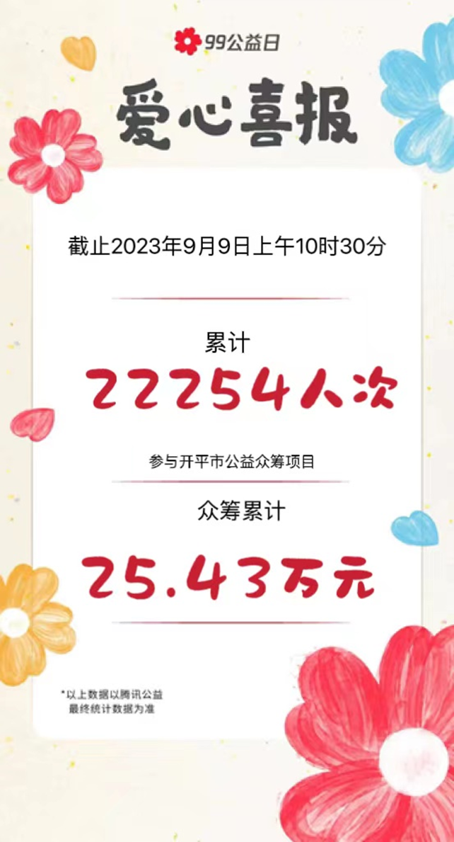涓滴之水成海洋,顆顆愛(ài)心變希望! 在大家的愛(ài)心支持下, 開(kāi)平市籌款數(shù)額 翻倍完成目標(biāo)。 在全市各機(jī)關(guān)企事業(yè)單位、社會(huì)團(tuán)體、志愿者及廣大市民朋友的積極參與和熱心支持下,我市“99公益日”眾籌活動(dòng)掀起了全民熱潮,在活動(dòng)啟動(dòng)配捐的第一天上午10時(shí)開(kāi)始,我市于12時(shí)30分就達(dá)到了籌款目標(biāo)。全民愛(ài)心接力仍不停步,直到活動(dòng)結(jié)束,我市共籌得善款254278.5元(含配捐),參與人數(shù)22254人次,籌款數(shù)額翻倍完成籌款目標(biāo)。 此次眾籌活動(dòng),群眾的參與度及熱情度達(dá)到了歷史新高,不僅取得了很好的籌資效果,而且極大提高了紅十字事業(yè)公信力建設(shè)。這些成績(jī)的取得,全得益于各市直機(jī)關(guān)單位、社團(tuán)組織、鄉(xiāng)鎮(zhèn)政府(街道辦)、學(xué)校、醫(yī)院以及社會(huì)愛(ài)心人士的大力支持,在此,開(kāi)平市紅十字會(huì)對(duì)所有參與本次活動(dòng)的愛(ài)心人士表示衷心感謝!感謝您和我們同心同行,為我市人道事業(yè)共同努力! 感謝大家對(duì)公益事業(yè)的支持和對(duì)紅十字會(huì)的信任! 我們鄭重承諾 所有愛(ài)心捐款 將嚴(yán)格按照 “ 公開(kāi)、公平、公正、透明”規(guī)定, 做好統(tǒng)計(jì)、執(zhí)行以及信息公開(kāi), 并接受社會(huì)監(jiān)督, 讓每一份愛(ài)心善意 都及時(shí)得到落實(shí)。 感恩遇見(jiàn)! 感謝有您!