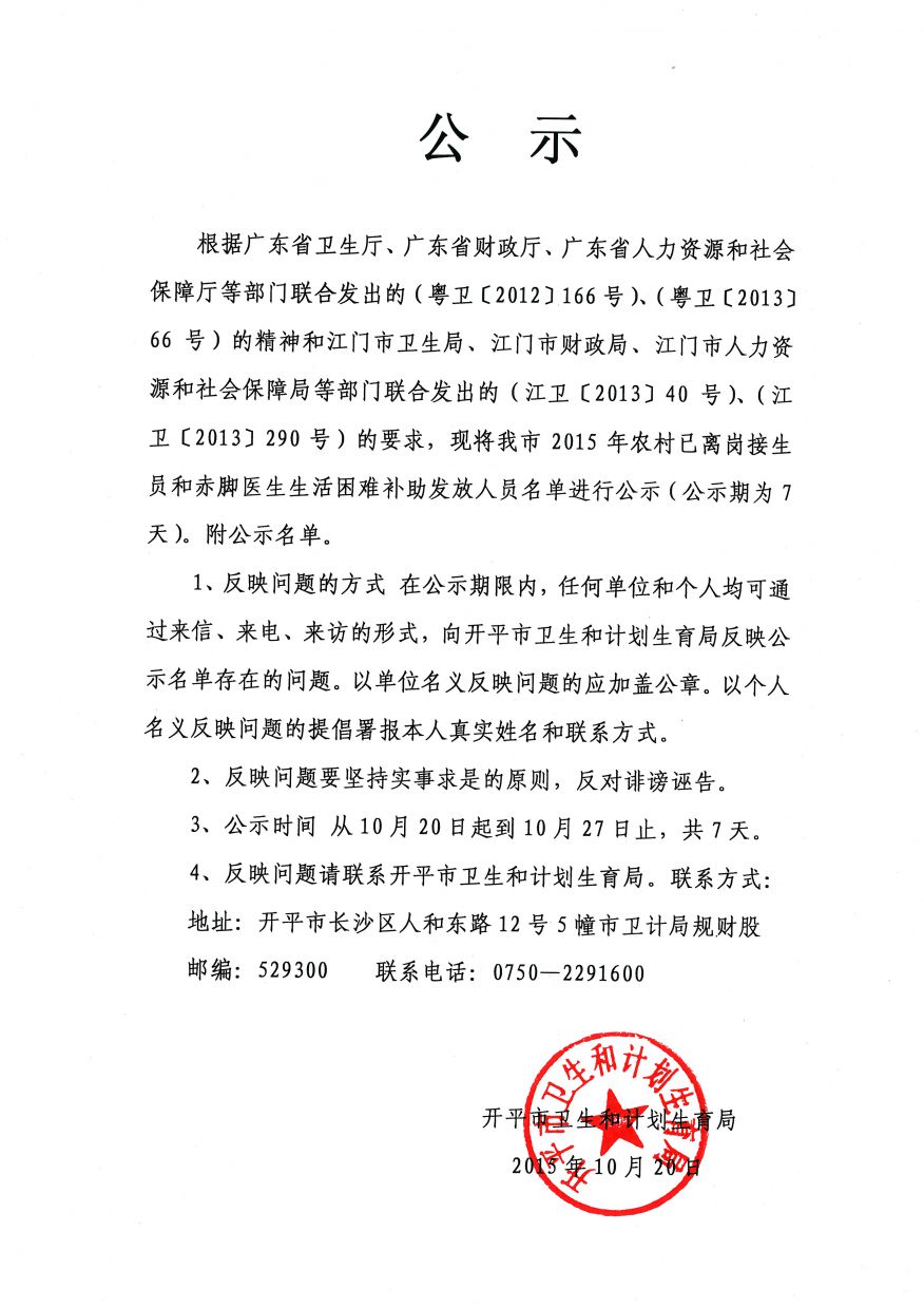 【公示】開平市2015年農村已離崗接生員和赤腳醫生生活困難補助發放人員名單