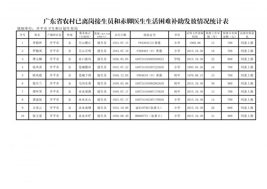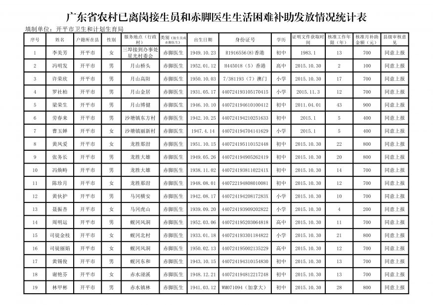 開平市2015年農村已離崗接生員和赤腳醫生生活困難補助補辦人員初審結果公示