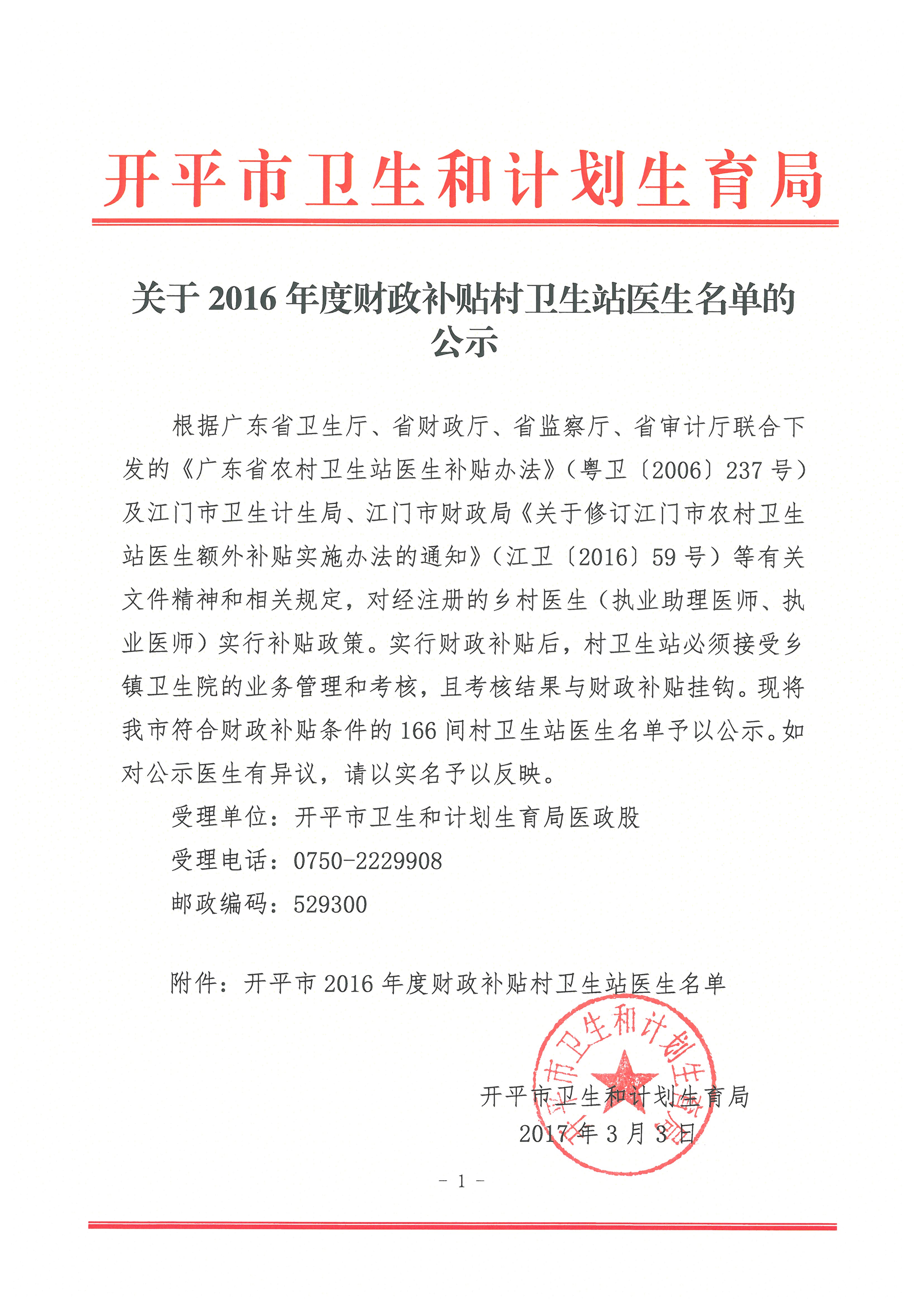 【開平市政府信息公開】關于2016年度財政補貼村衛生站醫生名單的公示http://zwgk.kaiping.gov.cn/Government/PublicInfoShow.aspx?ID=18550