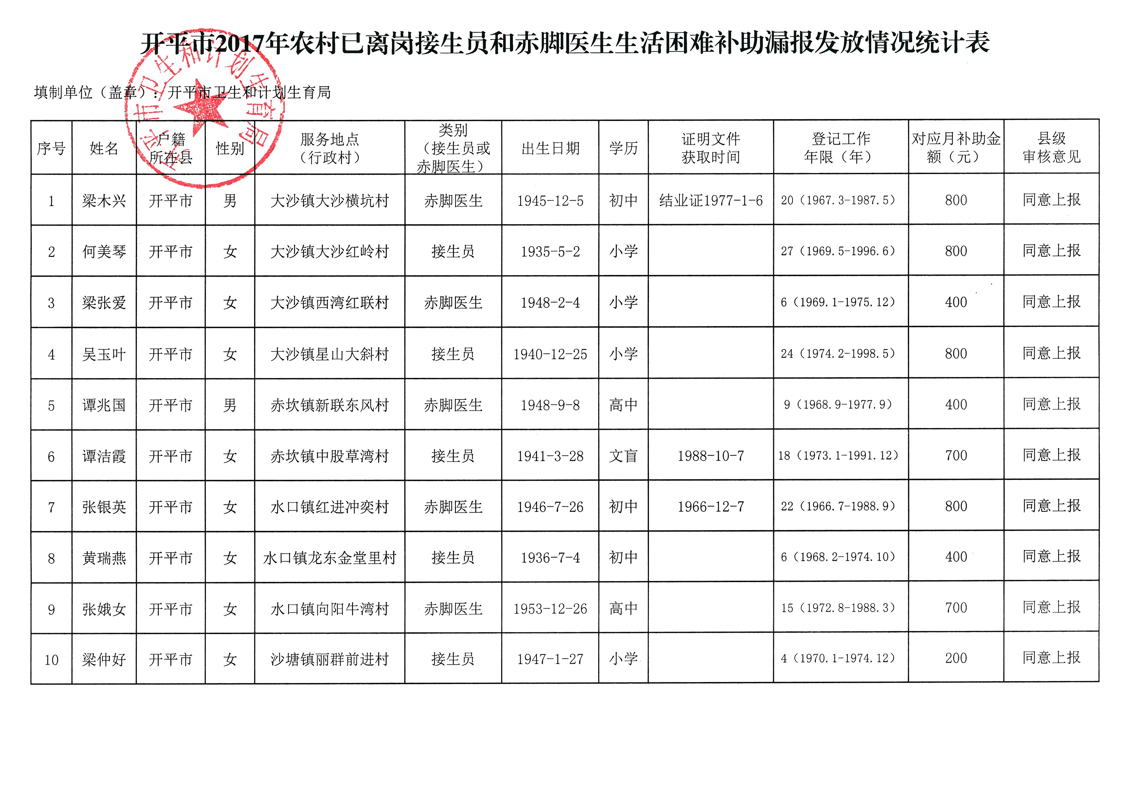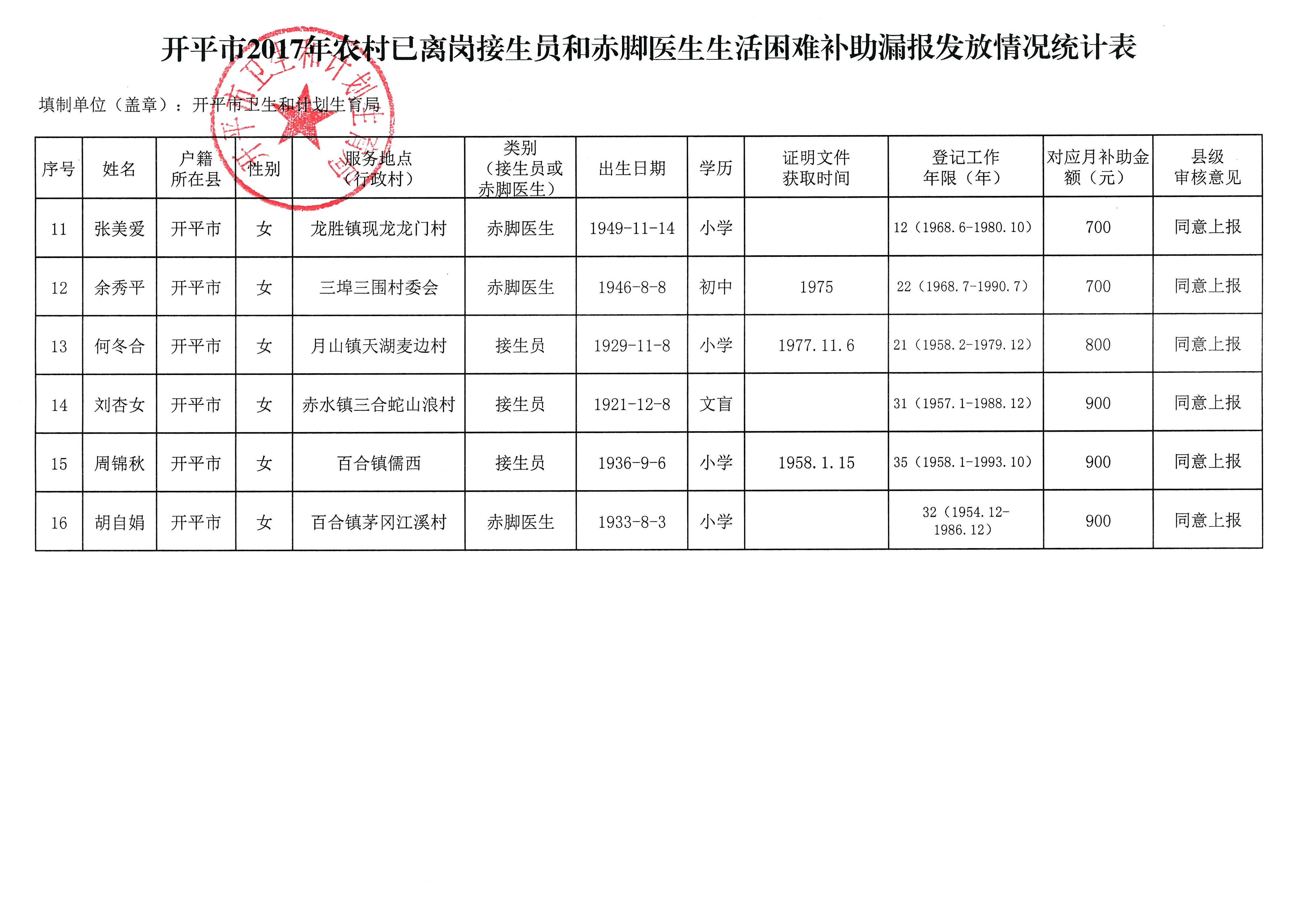 開平市2017年農村已離崗接生員和赤腳醫生生活困難補助漏報發放情況公示