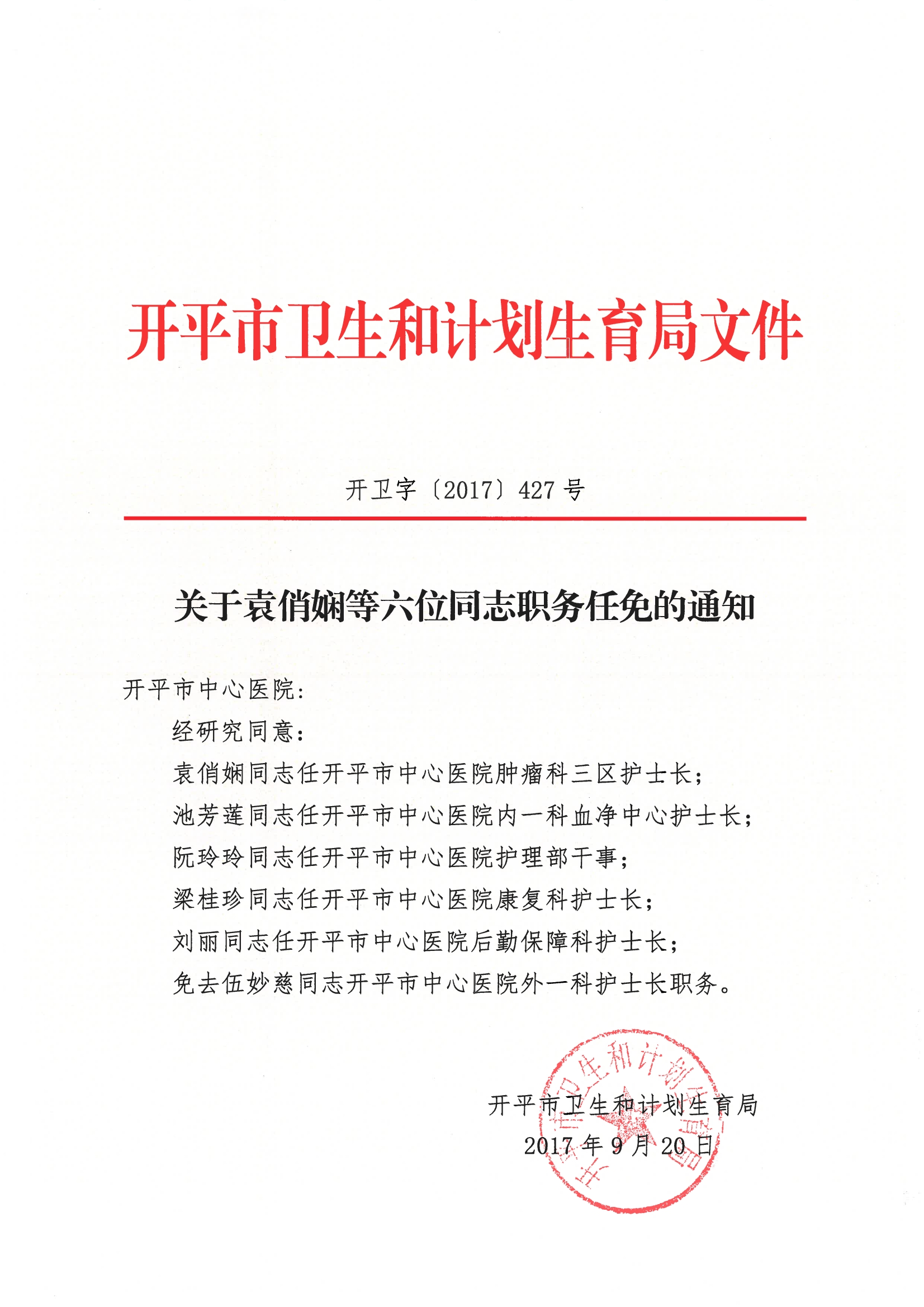 關于袁俏嫻等六位同志職務任免的通知(開衛字〔2017〕427號)