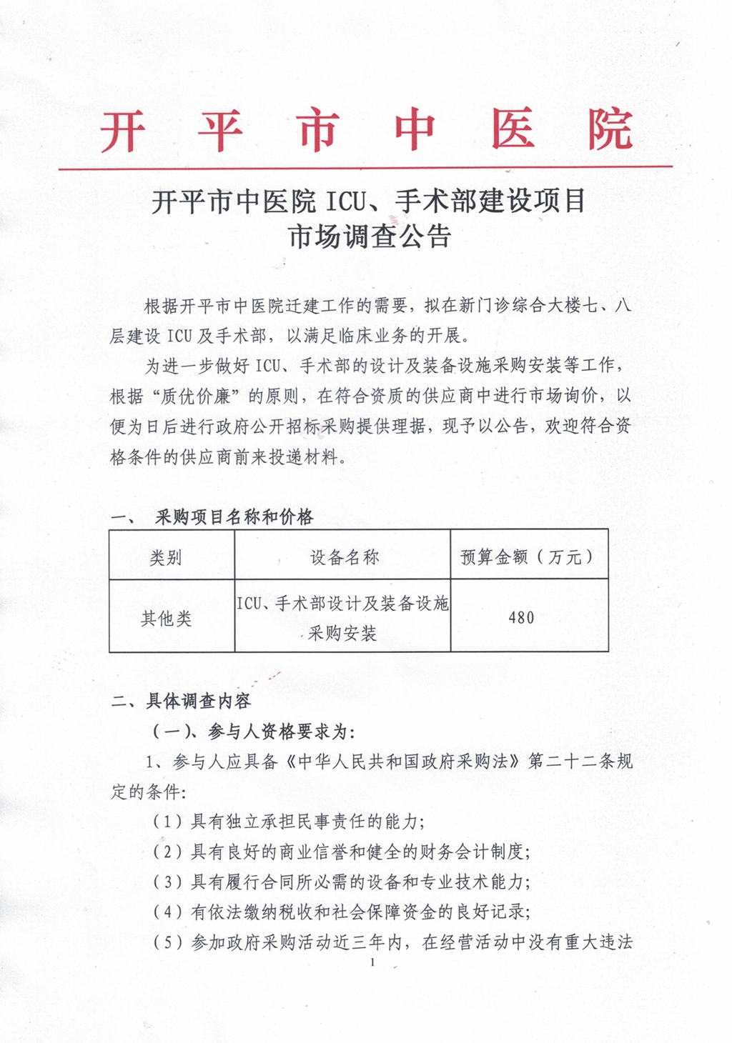 [09-08]開平市中醫院ICU、手術部建設項目市場調查公告