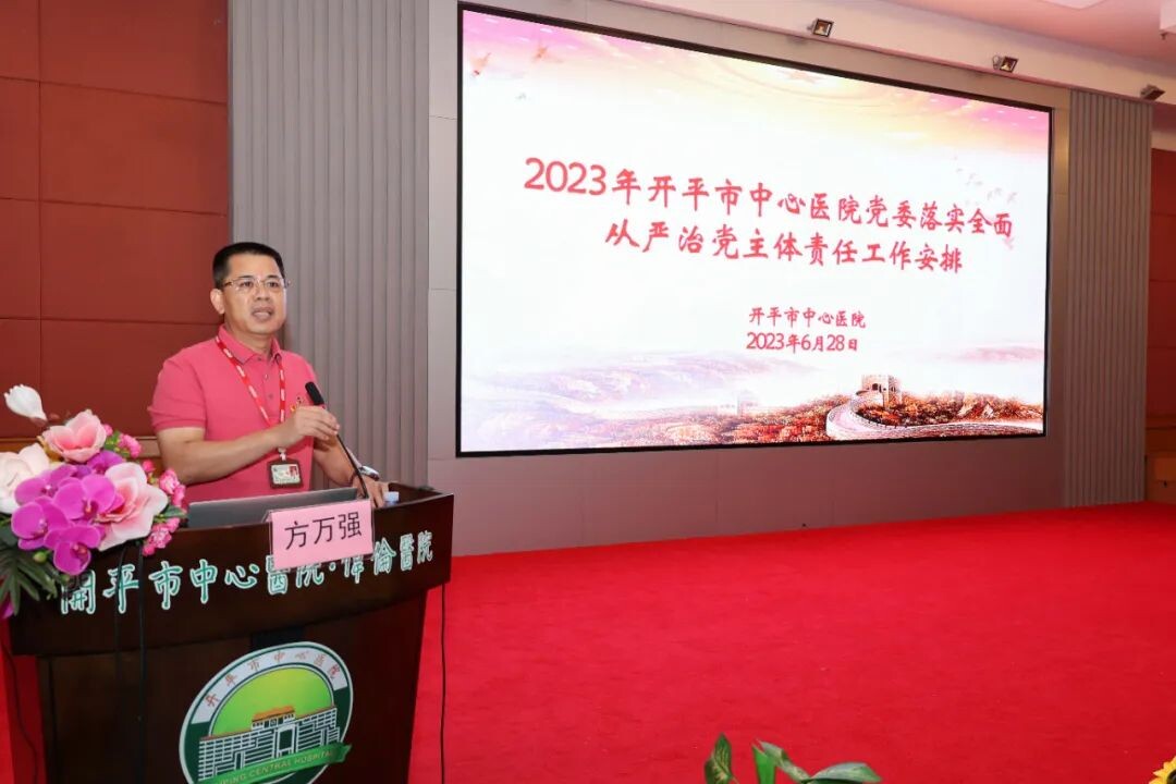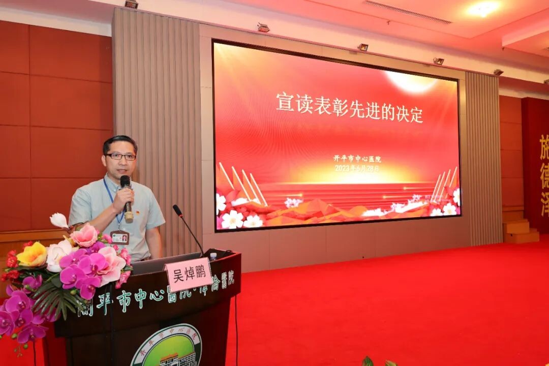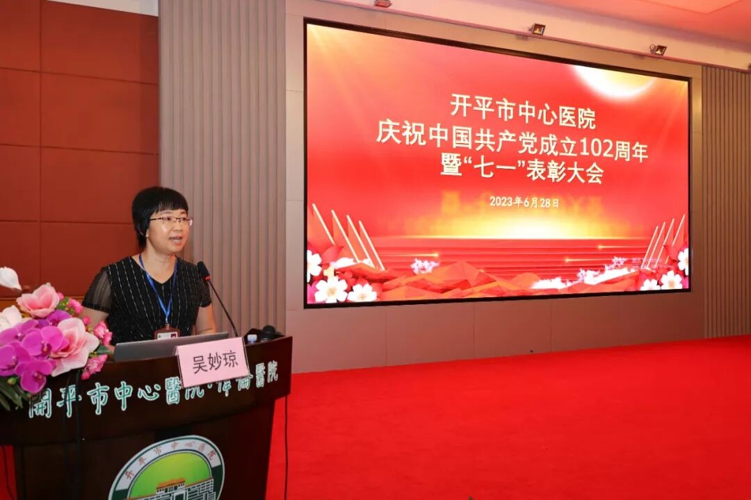 為學習貫徹習近平總書記視察廣東重要講話重要指示精神和《習近平著作選讀》主要精神,慶祝中國共產(chǎn)黨成立102周年,動員和激勵基層黨組織和全院黨員干部堅定理想信念,弘揚偉大建黨精神,進一步增強黨組織的政治功能和組織功能,根據(jù)上級黨組織的文件精神和工作部署,開平市中心醫(yī)院醫(yī)院黨委在建黨102周年之際舉行了慶祝中國共產(chǎn)黨成立102周年暨“七一”表彰大會。 ▲大會在莊嚴雄壯的國歌聲中拉開序幕。 ▲大會特別邀請開平市委宣講團成員梁東想同志宣講“學習貫徹習近平總書記視察廣東重要講話重要指示精神和《習近平著作選讀》主要精神”,讓習近平新時代中國特色社會主義思想在開平市中心醫(yī)院更好地落地生根、結(jié)出碩果。 ▲黨委書記方萬強就2023年開平市中心醫(yī)院黨委落實全面從嚴治黨主體責任工作安排進行黨課輔導。 ▲黨委副書記、院長吳焯鵬宣讀表彰先進的決定,進一步營造崇尚榜樣、爭當榜樣、積極向上、比學趕超的氛圍。 ▲黨委副書記鄺家俊就完成黨支部換屆改選宣讀《吳釗華等同志任職的決定》。 ▲黨委委員、副院長吳妙瓊要求全院黨員干部做好醫(yī)共體建設(shè)與主題黨日融合的無縫對接。 ▲新黨支部書記代表劉艷虹同志作了表態(tài)發(fā)言,宣誓、承諾作為一名新黨支部書記,將堅持黨建引領(lǐng),用自己的實際行動,當好黨支部書記,把黨建工作全面融入日常工作中。 ▲全院黨員干部還觀看了視頻《時代楷模