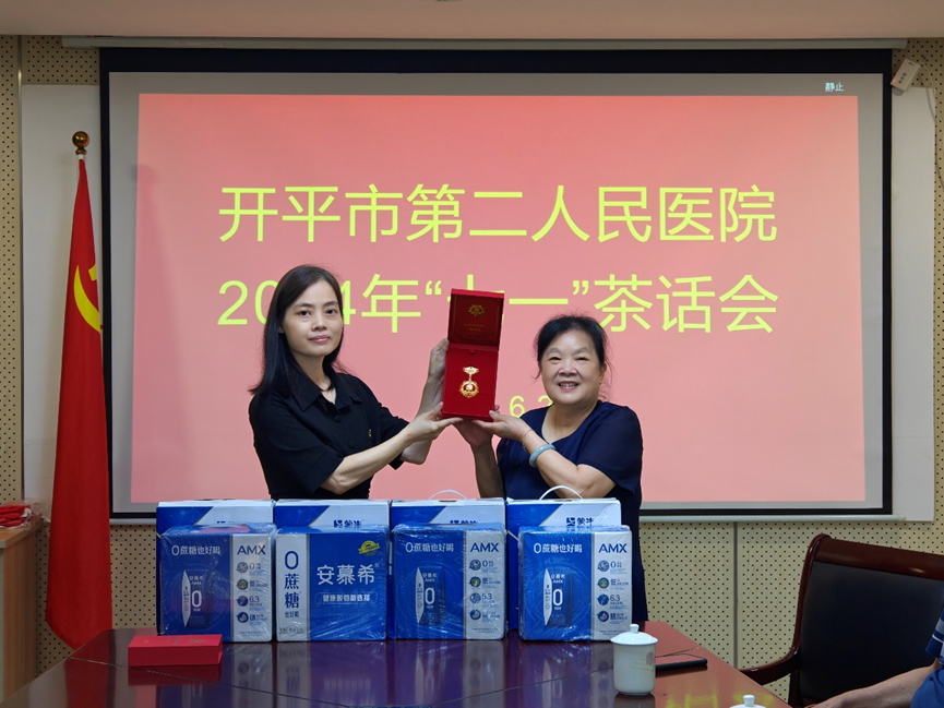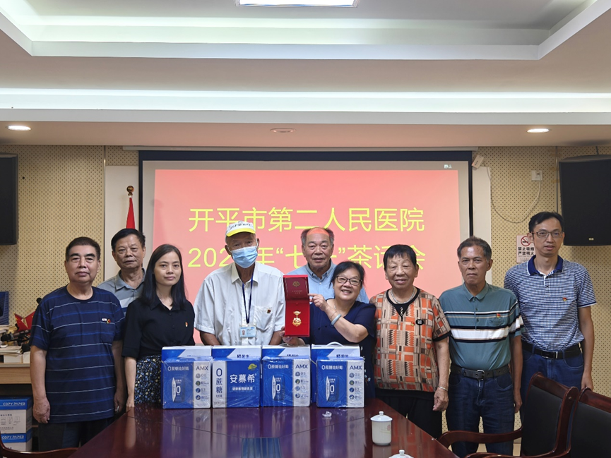 6月28日,在即將迎來中國共產黨成立103周年之際,開平市第二人民醫院舉行“七·一”退休黨員茶話會暨“光榮在黨50年”紀念章頒發儀式,感謝退休黨員對第二人民醫院發展貢獻青春與汗水的老黨員致以崇高的敬意與節日慰問。同時,為黃萍好同志頒發“光榮在黨50年”紀念章。開平市第二人民醫院黨支部委員吳鳳蓮、組織人事股股長劉偉光等同志出席本次活動。 吳鳳蓮代表醫院黨政領導班子向該院退休黨員致以節日的慰問,感謝其在醫院發展的過程中所作出的貢獻,對退休返聘仍堅守在一線崗位的退休黨員致以崇高的敬意。茶話會上吳鳳蓮向退休老黨員匯報了近年醫院發展的相關情況。 五十年黨齡,五十載光榮。吳鳳蓮向退休黨員黃萍好頒發了“光榮在黨50年”紀念章,望其今后一如既往發揮自身的優勢,為衛生健康事業建言獻策、加油鼓勁、點贊喝彩。