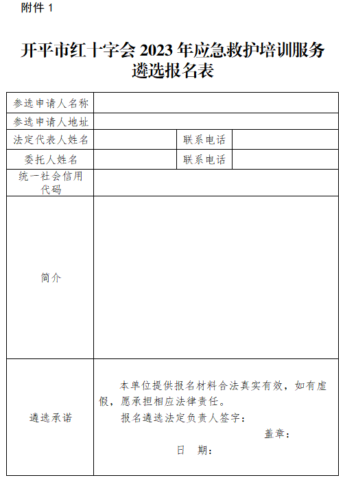 (一)開平市紅十字會2023年應急救護培訓服務遴選報名表(附件1);