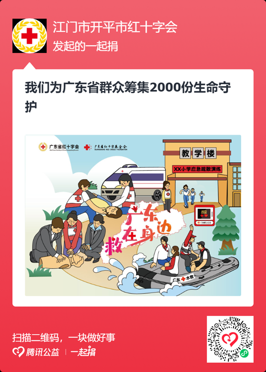 守護生命,救在身邊! 開平市紅十字會“5?8人道公益日”眾籌活動 倡議書 社會各界愛心單位、愛心人士、廣大市民: 5月8日是“世界紅十字日”,為弘揚“人道、博愛、奉獻”的紅十字精神,倡導“人人皆可參與”的公益理念,中國紅十字會總會發起“5?8人道公益日”眾籌活動。開平市紅十字會在廣東省紅十字會“廣東救在身邊”項目下組建“一起捐”隊伍,籌得款項將用于開展應急救護知識和技能培訓,購置AED、急救包等急救設備或救援設備。 在此,我們懷著最真摯、最崇敬的心情向社會各界發出倡議:請您伸出溫暖的雙手,敞開仁愛的胸懷,加入到“5?8人道公益日”募捐活動中來!打開手機,動動手指,掃描下方小程序碼與“我們一塊做好事”!同時也請您轉發至朋友圈,發動更多愛心人士支持! 募捐時間:即日起至5月9日(其中5月7-9日每天早上10時開始,每筆1元以上捐贈,將有機會獲得隨機金額配捐,每人每天可獲配捐總額上限為999元。) 廣東省開平市紅十字會 2023年5月3日 我們鄭重承諾,將按照“公開、公平、公正、透明”的原則尊重捐贈者意愿,充分發揮紅十字的職能,實施“救在身邊”項目,管理使用好全部善款并接受第三方審計和社會監督,及時向社會公布。 開具捐贈發票操作步驟 微信小程序搜索“騰訊公益”進入首頁——右下角點“我的”——更多記錄——我的捐贈票據——索取紙質捐贈票據——選擇要開具票據的項目(廣東救在身邊)——點擊“查看詳情”并選擇對應項目——填寫開票信息——確認提交(將由廣東省紅十字會財務開具電子發票發送至手機或郵箱) 愛心點燃希望,奉獻成就美好 讓我們一起積小善,成大愛! 愛的接力,讓這個世界更加溫暖!