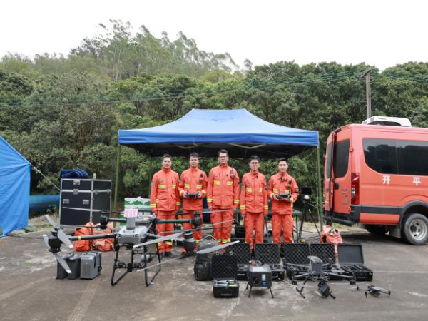 Ⅳ 級應急響應,市森防辦牽頭成立現場指揮部,劃分ABCD四個作戰區域,調集江門駐防分隊、市應急救援大隊、消防救援大隊等專業力量增援。演練中,無人機偵察火情、370自組網保障通信、大型無人機運輸物資等科技裝備全面應用,各隊伍采用