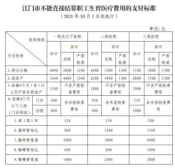 未辦理產前檢查就醫確認手續、未按規定辦理變更產前檢查定點醫療機構或因參保職工個人原因造成生育醫療費用不能直接結算的,可以向參保地醫療保障經辦機構申請零星報銷,具體支付標準如下表。