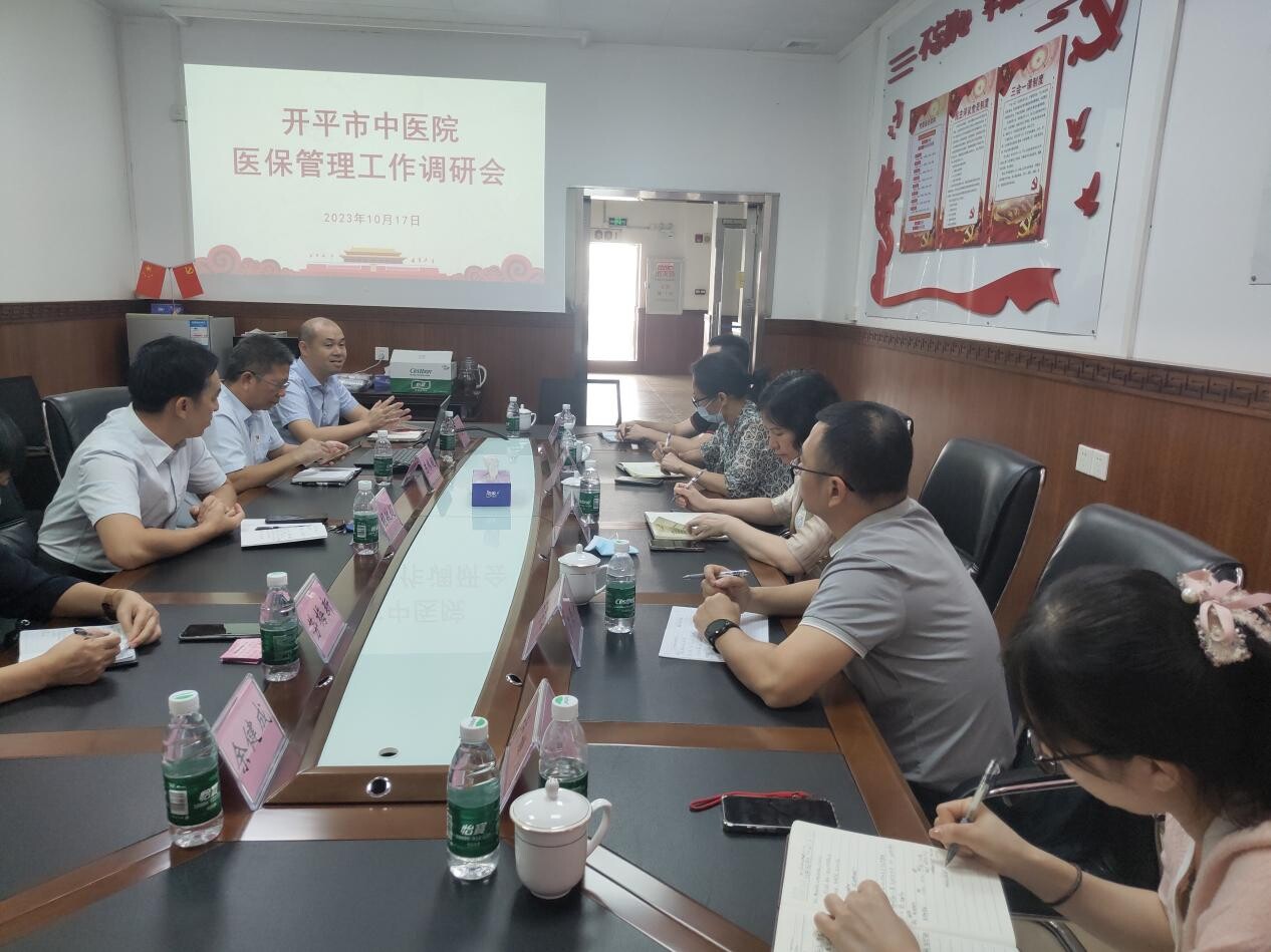 10月17日上午,開平市醫療保障局黨組書記莊冬梅和市政協副主席、局長梁榮華帶隊到市中醫院就醫療保障管理工作情況進行調研。市中醫院黨委副書記、院長胡敏超及其他領導班子成員參加調研。