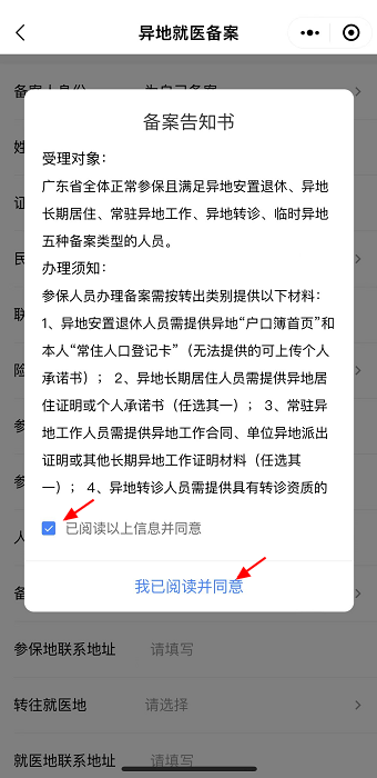 【第三步】點擊“異地就醫備案”圖標小程序會彈出“備案告知書”,請大家認真閱讀告知書事項,等待5秒鐘然后勾選“我已閱讀并同意備案告知書”,點擊“我已閱讀并同意”后,進入備案界面。