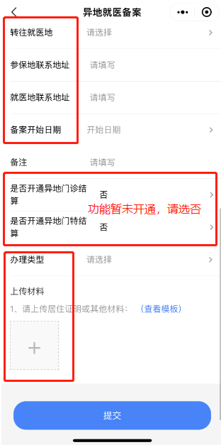需注意的是,我市參保人【備案類例】選擇異地安置退休人員、異地長期居住人或常駐異地工作人員的,備案前需填寫好《廣東省異地就醫登記備案表》(可通過登陸江門市醫療保障局官方網站“通知公告——江門市醫療保障經辦業務常用表格下載”下載),并在“上傳材料”處一同拍照上傳。