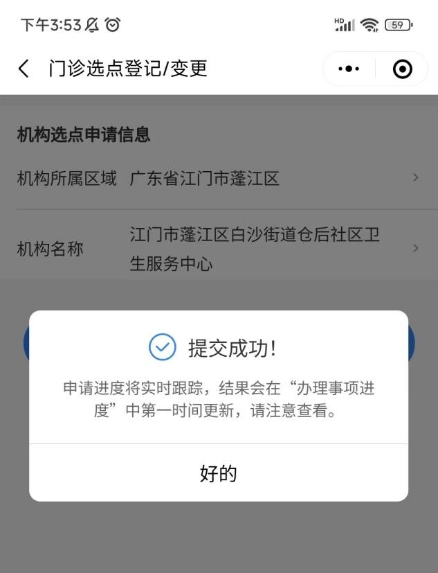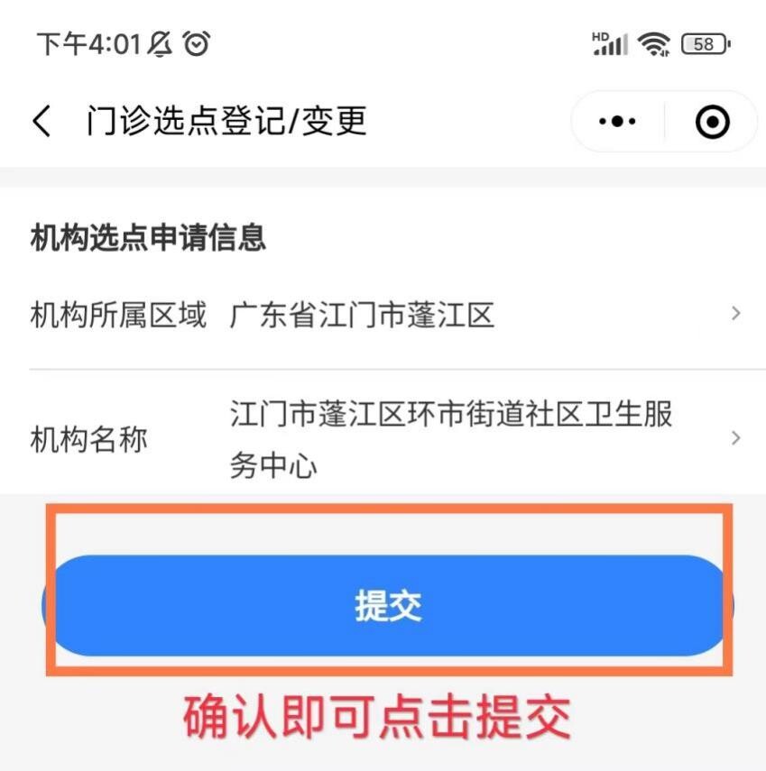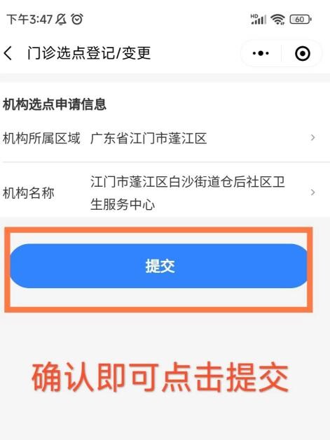 第三步:選擇需要門診選點登記的定點醫(yī)療機構(gòu),完成后點擊提交,系統(tǒng)顯示“提交成功”,選點結(jié)果信息可在前端頁面展示。