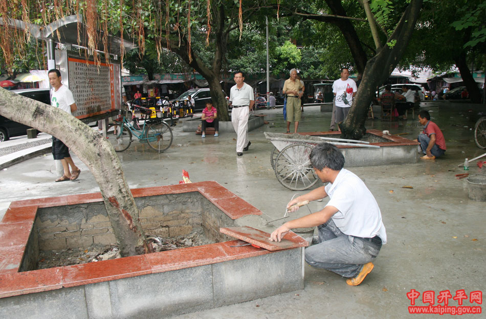 改造前的開華路街心小公園地面凹凸不平,部分地方已破裂,容易積水,樹木側石已陳舊破損,高低不一,整個公園環境比較臟亂。為改變舊貌,創造休閑娛樂文明場所,市政府從7月開始對其進行改造。記者在現場看到,本次改造主要是拆除舊地面,重鋪水泥地面,安裝排水管,砌樹木側石,貼花崗巖板。市園林局有關負責人表示,計劃在小公園內設置石凳及健身器材,爭取7月底完工。