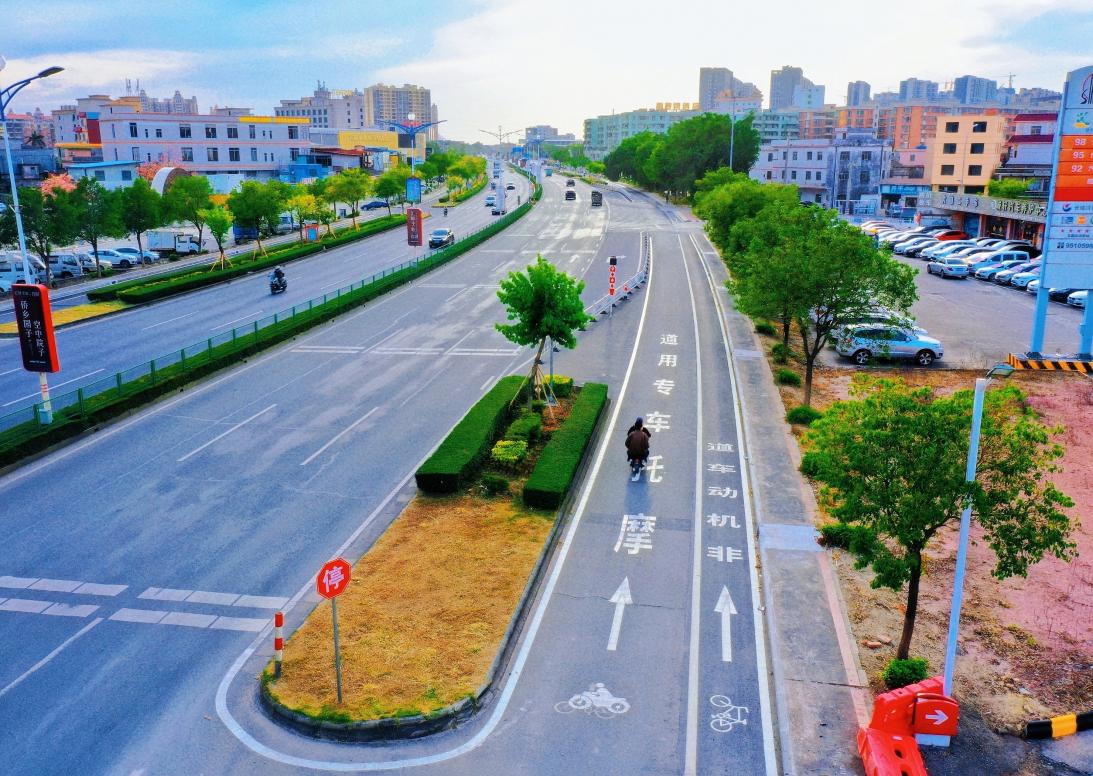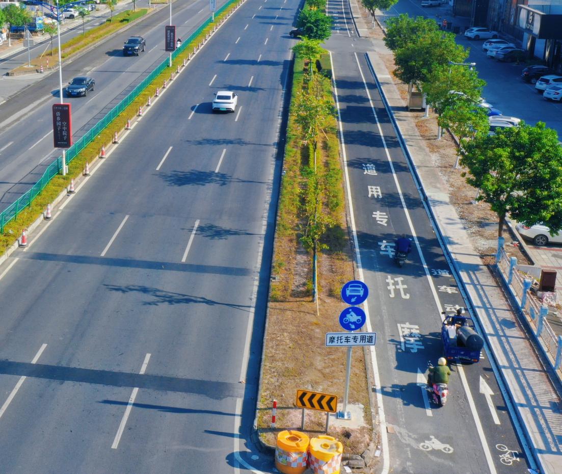 因地制宜,方寸間巧施策修路解民憂。本次第三期非機動車道整治項目起點位于中業新城(東興大道平交口),終點位于西環跨線橋段,全長約4公里,通過巧妙利用現有空間資源,借助人行道富余空間等措施擴寬非機動車道,整治后該路段兩側邊花圃外的非機動車道由3.2米加寬至4.5米,重新設置為3.25米摩托車專用道+1.25米非機動車道,并增設相應的標志標線。整治完成后,將打通沙岡工業園至西環跨線橋段總長約11公里摩托車、非機動車“專屬通道”,著力解決“機非混行”的問題,保障非機動車路權,營造安全有序的交通出行環境。