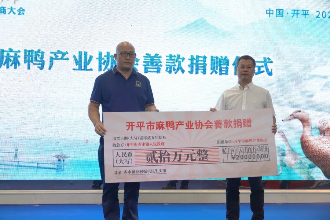 同時(shí),開(kāi)平市麻鴨產(chǎn)業(yè)協(xié)會(huì)現(xiàn)場(chǎng)向赤水鎮(zhèn)人民政府捐贈(zèng)20萬(wàn)元,專(zhuān)項(xiàng)用于支持赤水鎮(zhèn)鄉(xiāng)村振興民生建設(shè)。